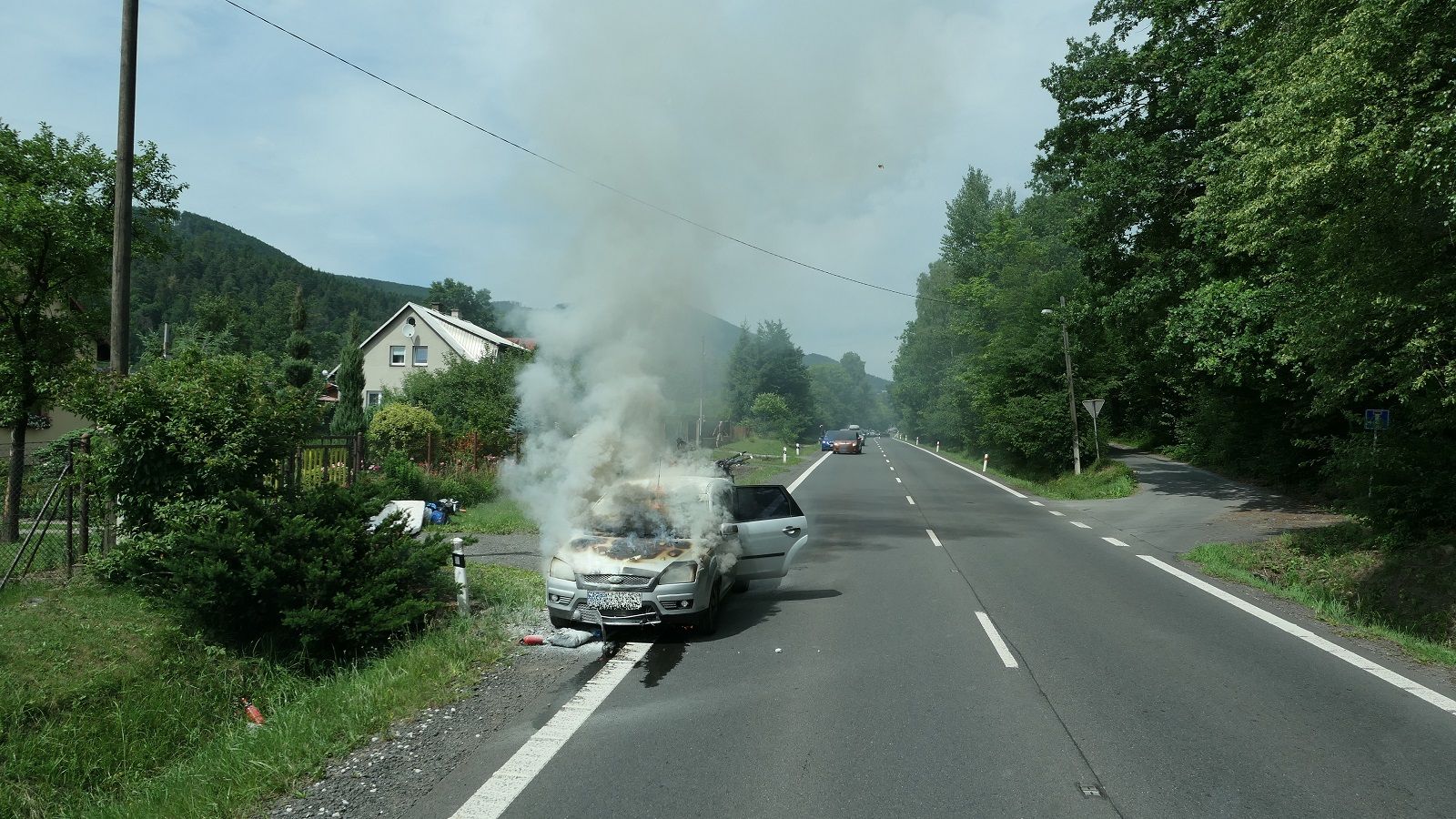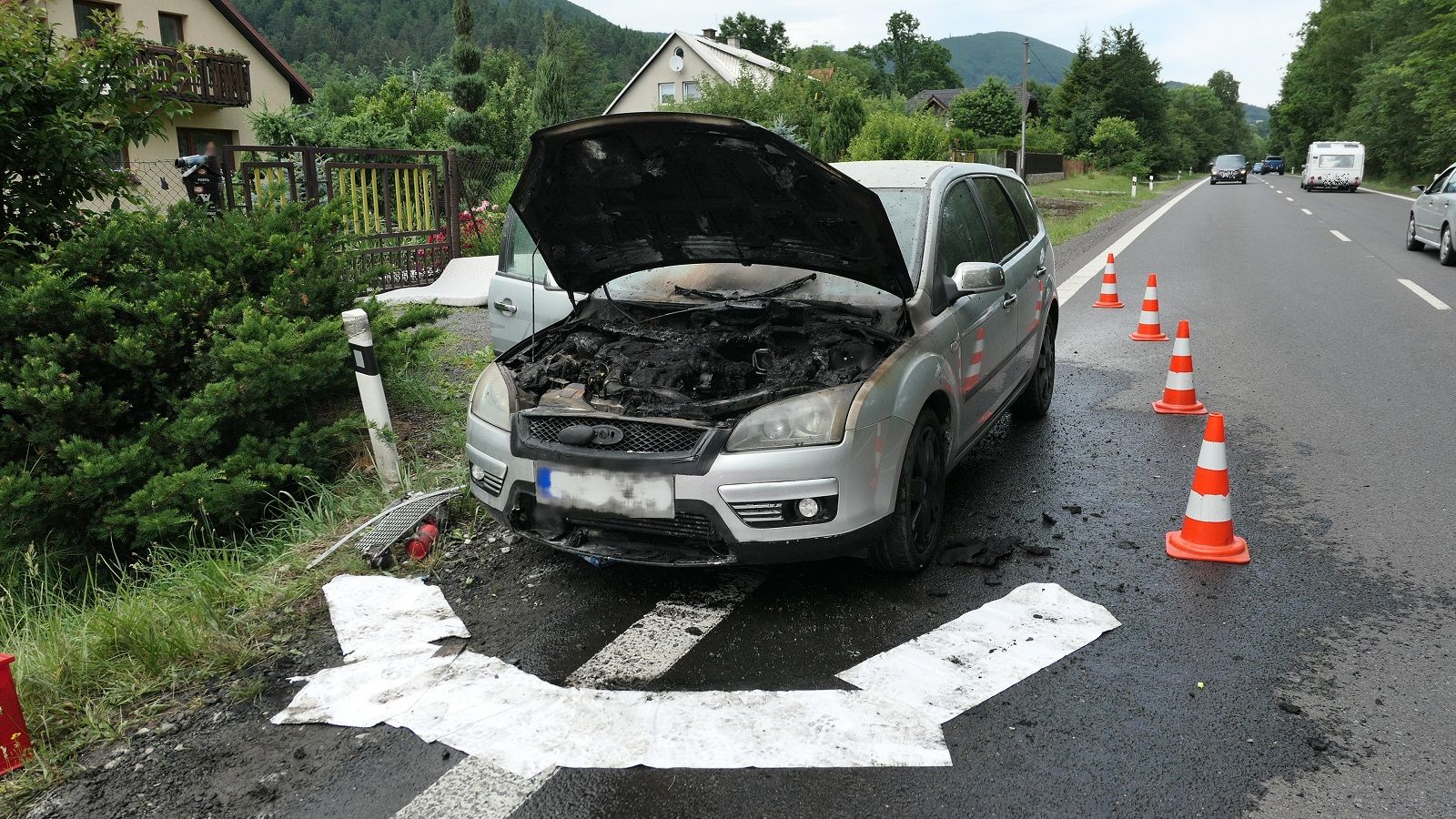 Hasiči už při příjezdu viděli, že vozidlo hoří v motorovém prostoru. Požár byl uhašen jedním vysokotlakým proudem vody. Řidič hasičům sdělil, že auto začalo hořet během jízdy a že se před jejich příjezdem snažil uhasit požár vypůjčenými přenosnými hasicími přístroji.