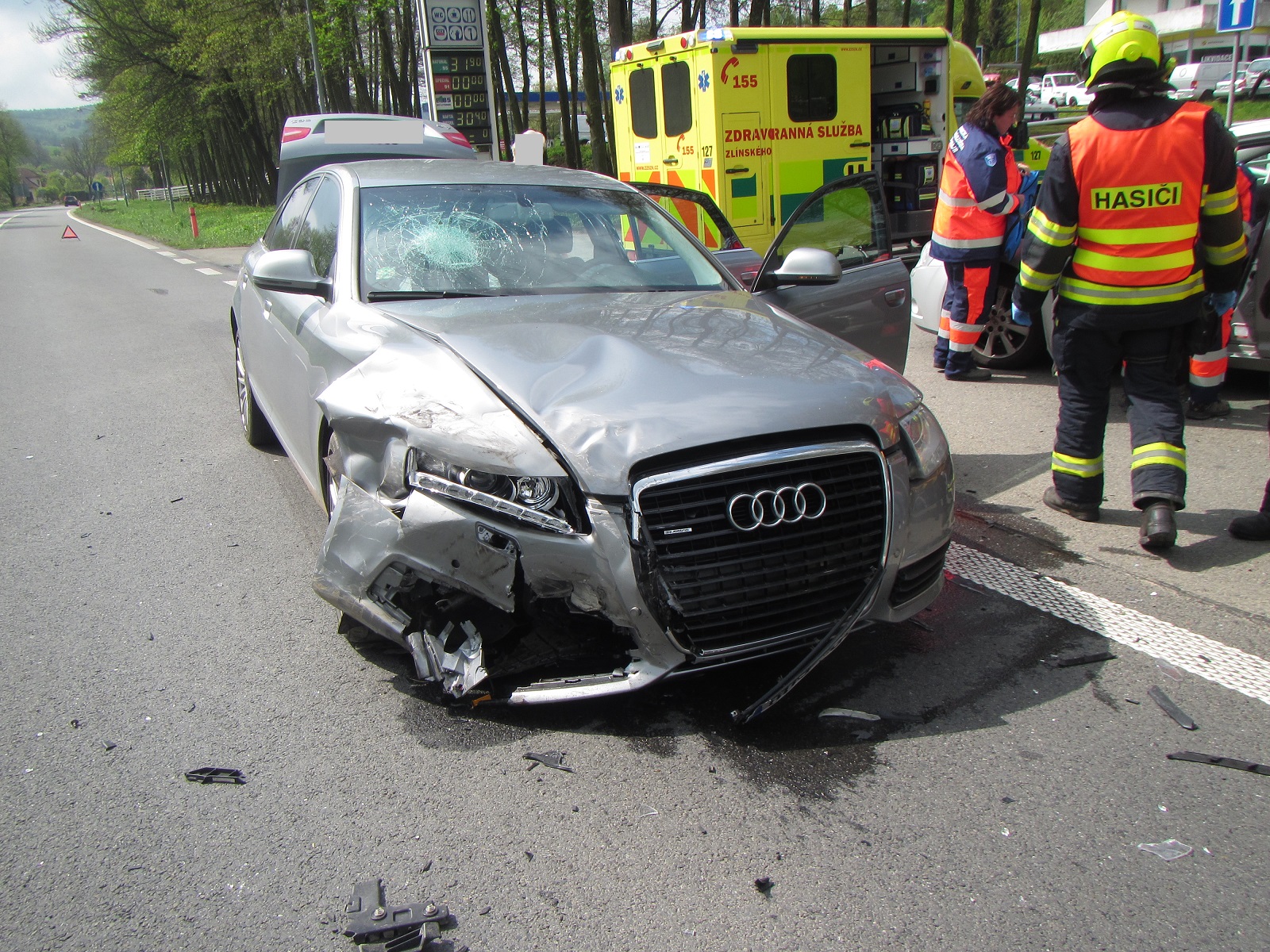 Před vjezdem k čerpací stanici, na silnici číslo 490, stály osobní vozy značky Toyota a Audi. Řidič z vozu Toyota už byl v péči zdravotnické záchranné služby. Zdravotníci si zraněného muže odvezli k dalšímu vyšetření do nemocnice. Z poškozených vozů nevytékaly pohonné hmoty ani oleje.