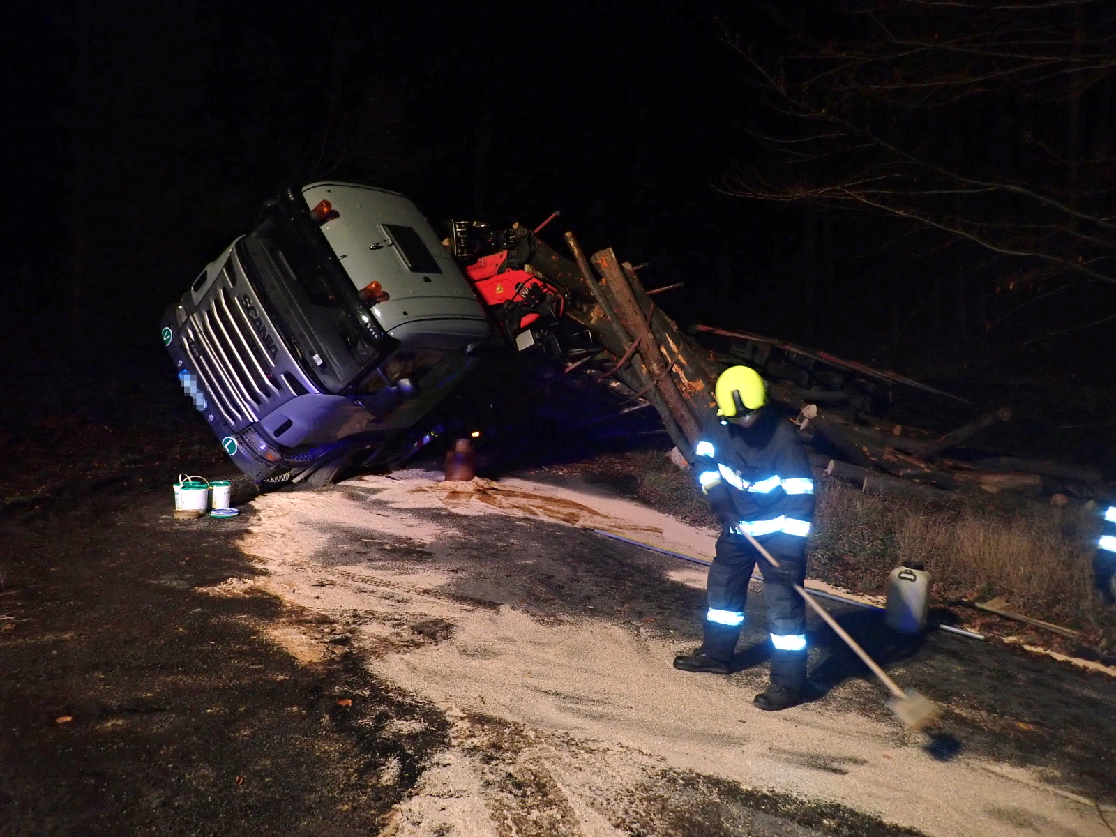 Při převrácení části soupravy došlo k úniku hydraulického oleje, který hasiči na pokyn velitele postupně zachycovali do připravených nádob. Úniky na komunikaci pak byly zlikvidovány pomocí speciálních sorpčních látek. Odstranění nákladu a vyproštění soupravy, které bude probíhat druhý den, si zajistil majitel vlastními silami.