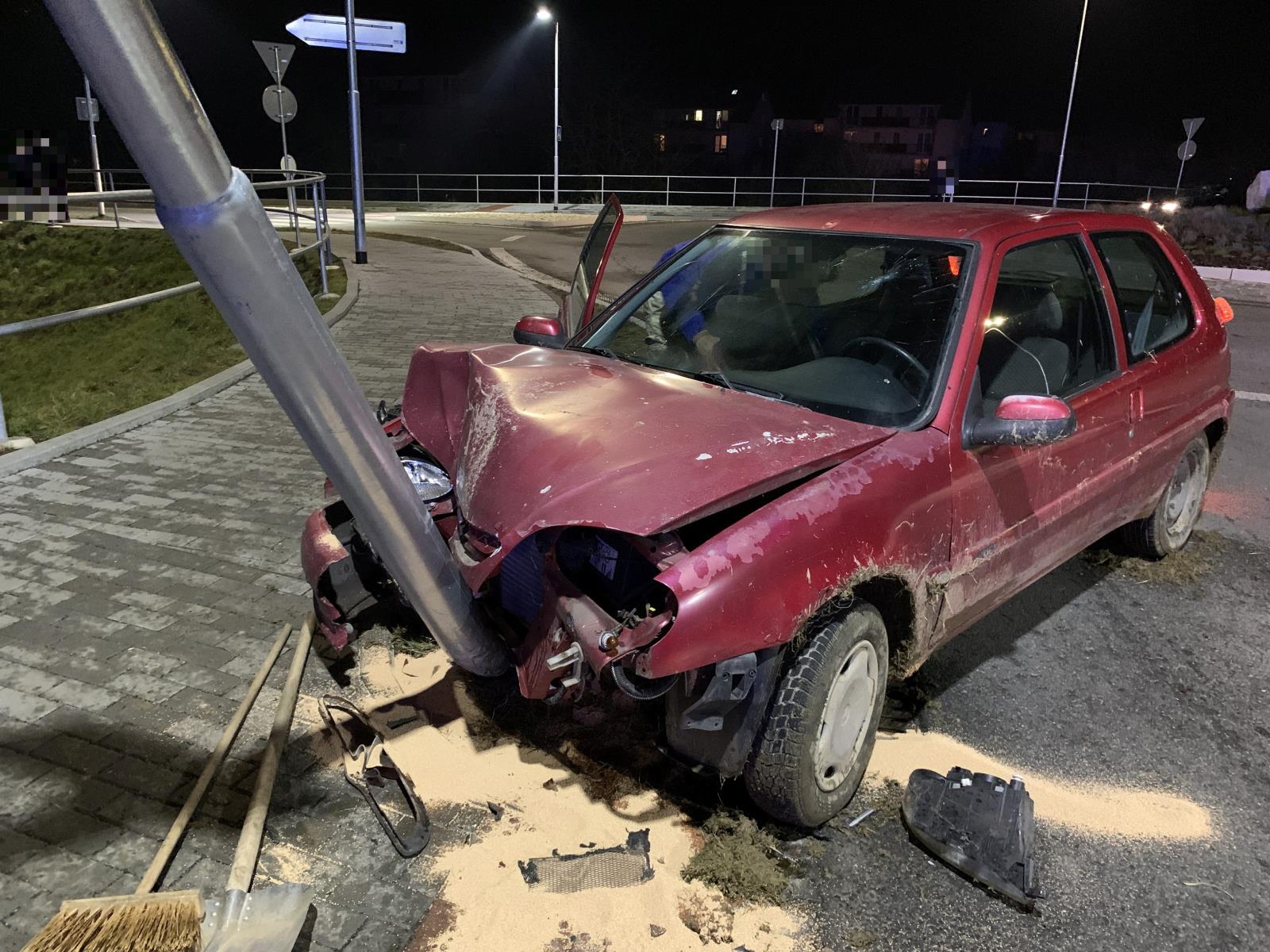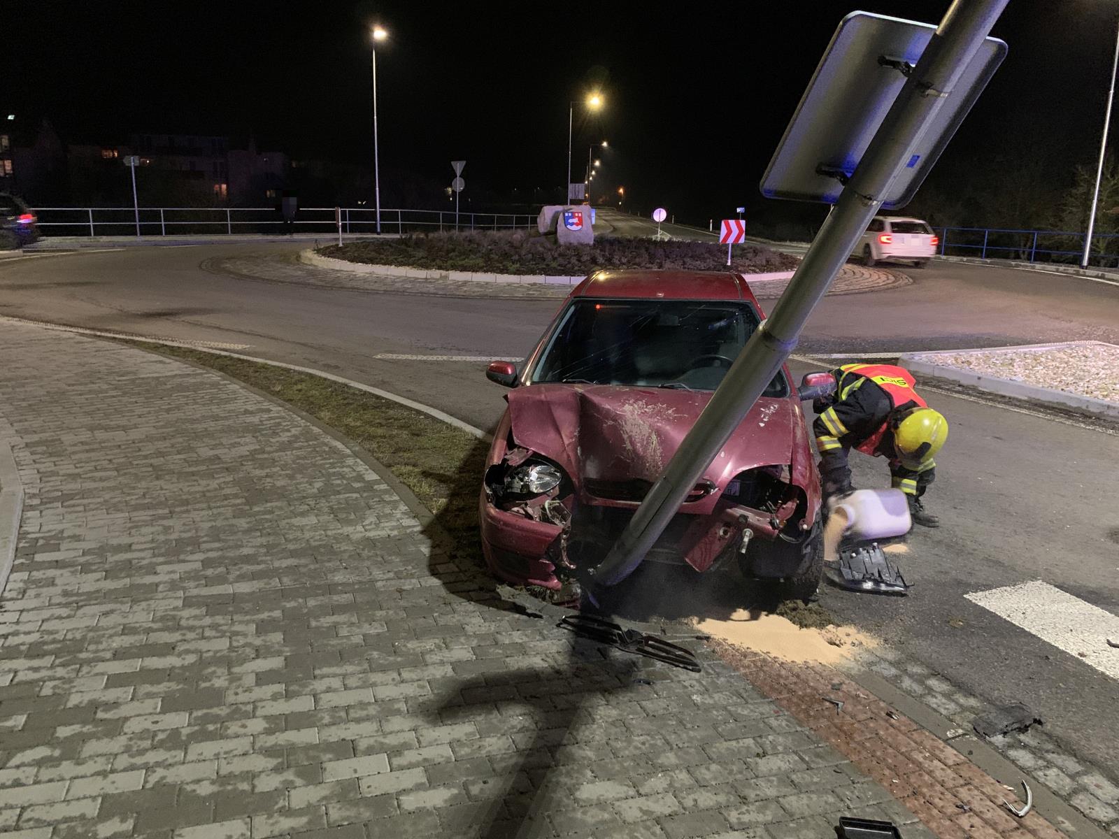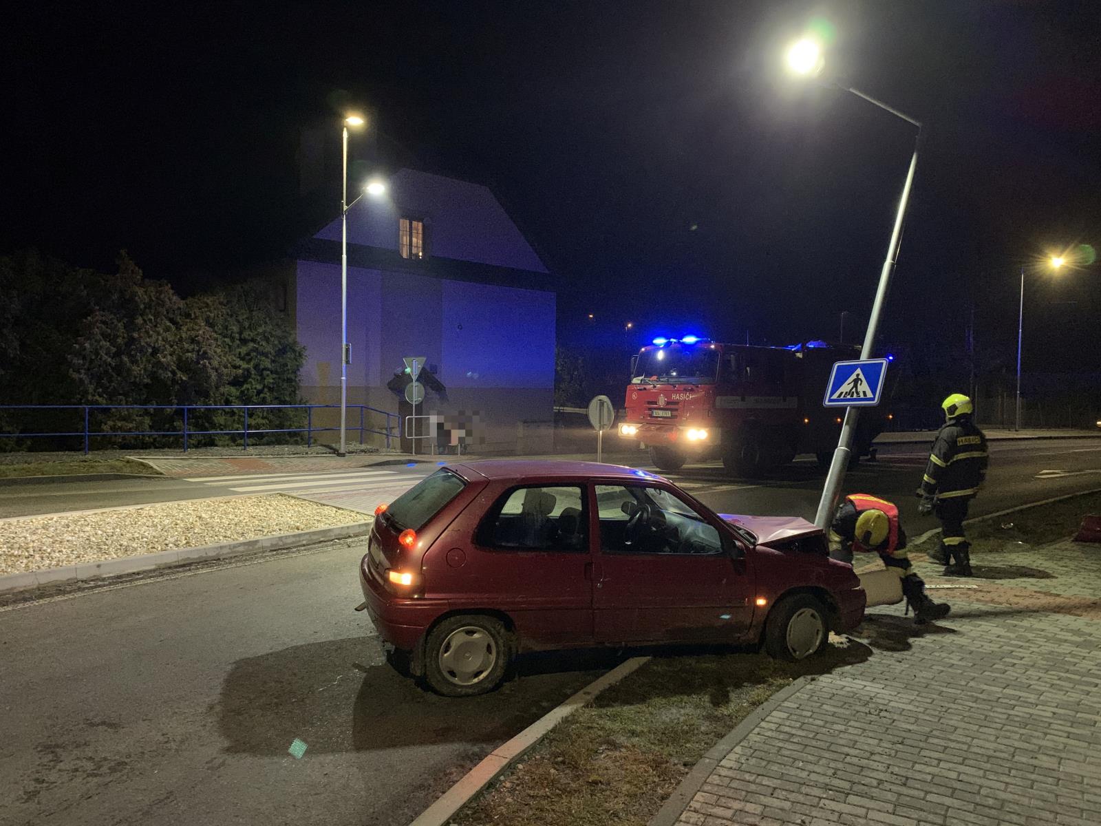 Zde řidič osobního auta narazil do pouličního osvětlení. Nehoda se naštěstí obešla bez zranění. Hasiči u vozidla provedli protipožární opatření a zasypali sorbentem uniklé provozní kapaliny.