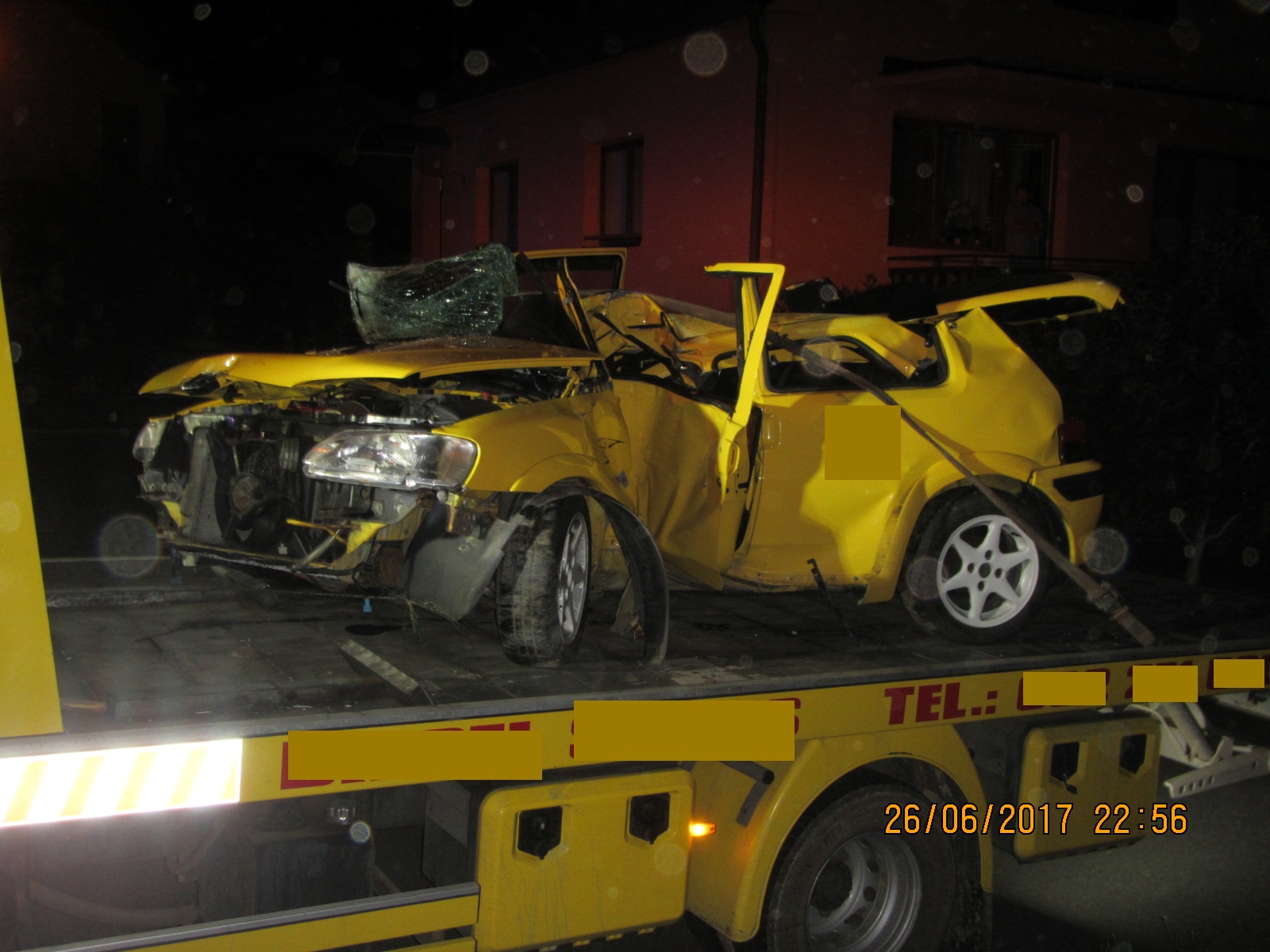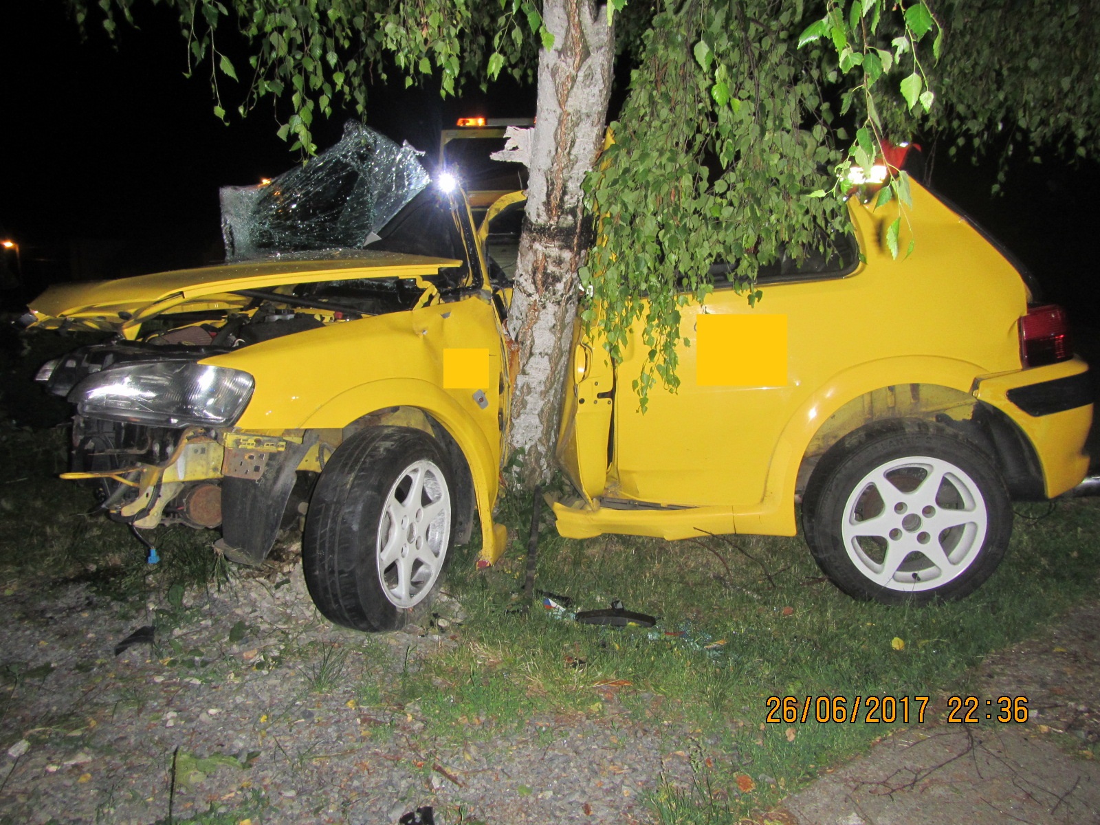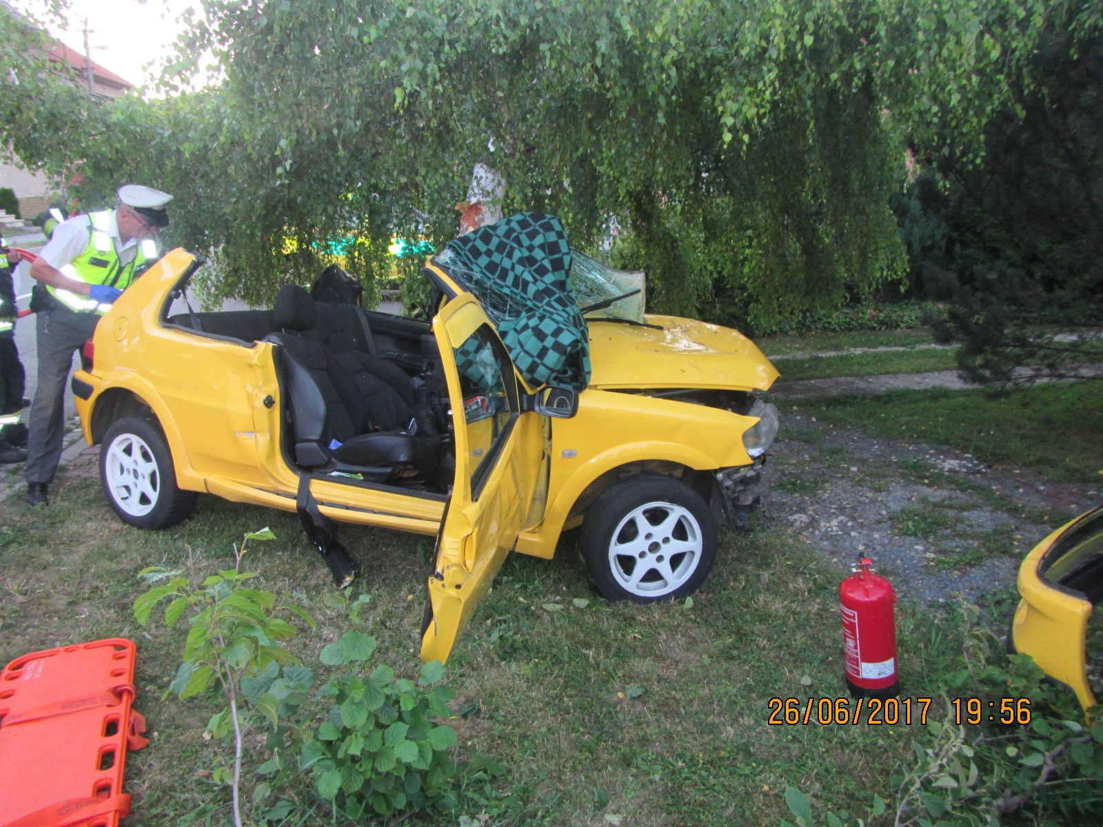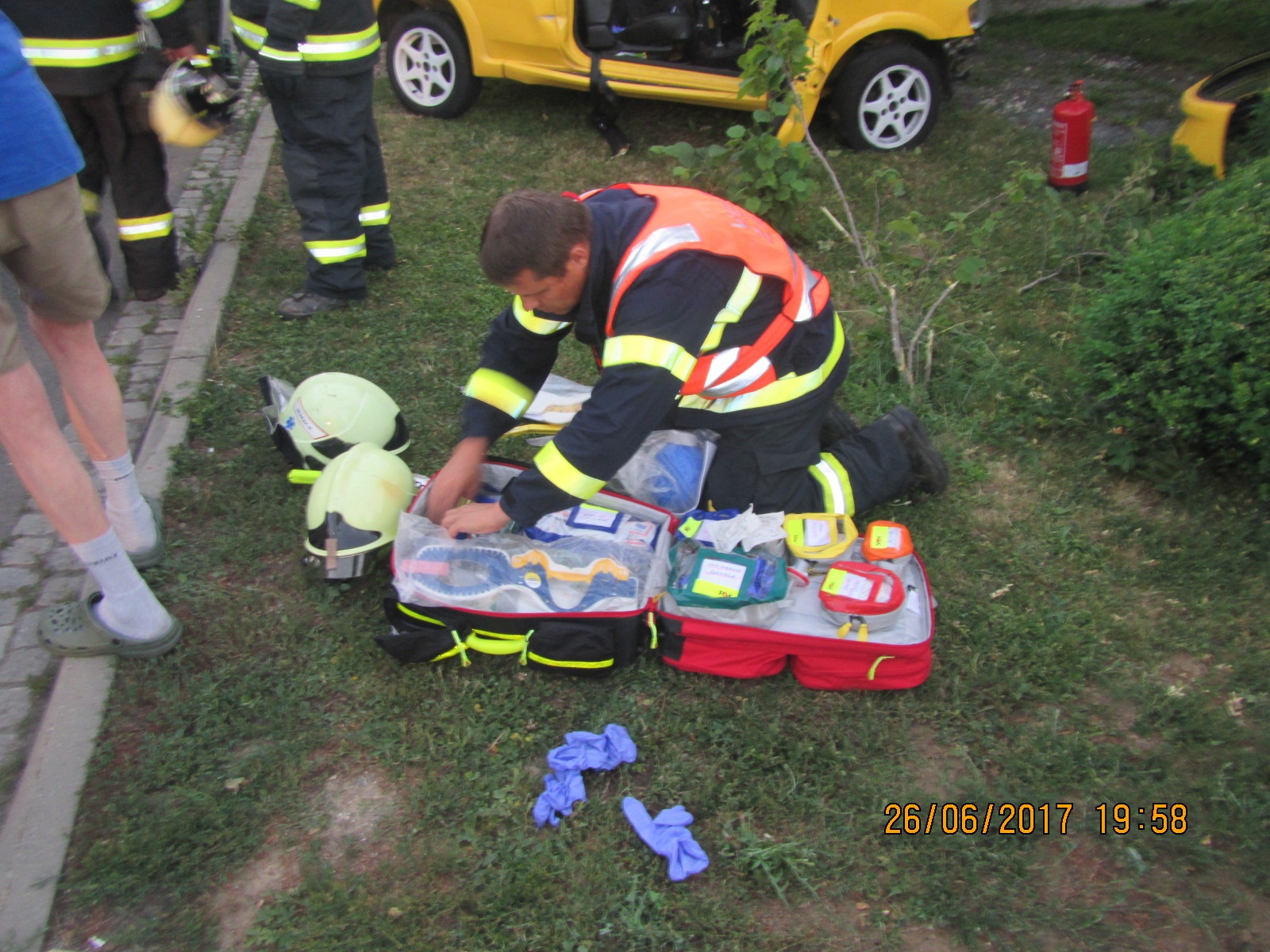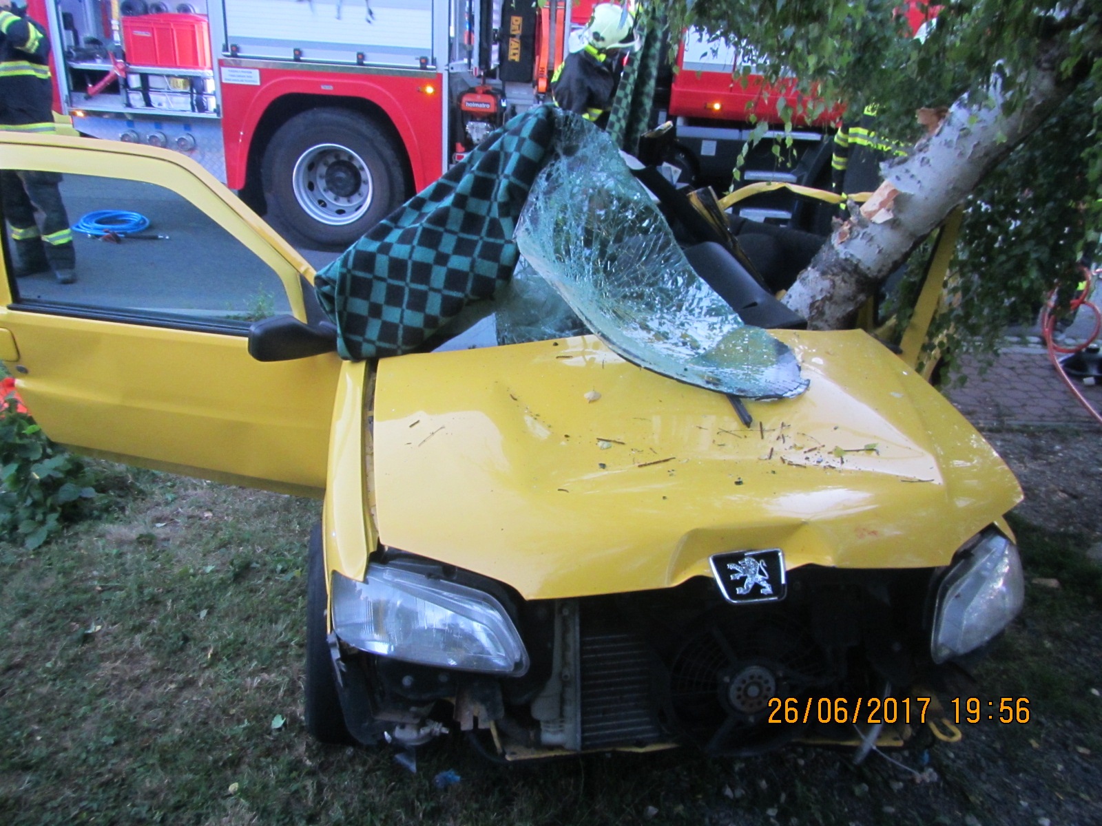 Na místě nehody byl v stromě osobní vůz. Řidič byl zaklíněný uvnitř auta. Hasiči s hydraulickým vyprošťovacím zařízením odstranili střechu vozu a zraněného řidiče na páteřní desce z auta vyprostili. Zraněnému nasadili kyslík a společně s místní obyvatelkou, zdravotnicí, poskytli řidiči předlékařskou pomoc. Po příjezdu sanitky předali zraněného do péče zdravotníků.