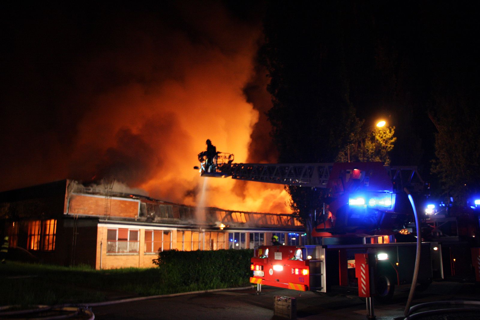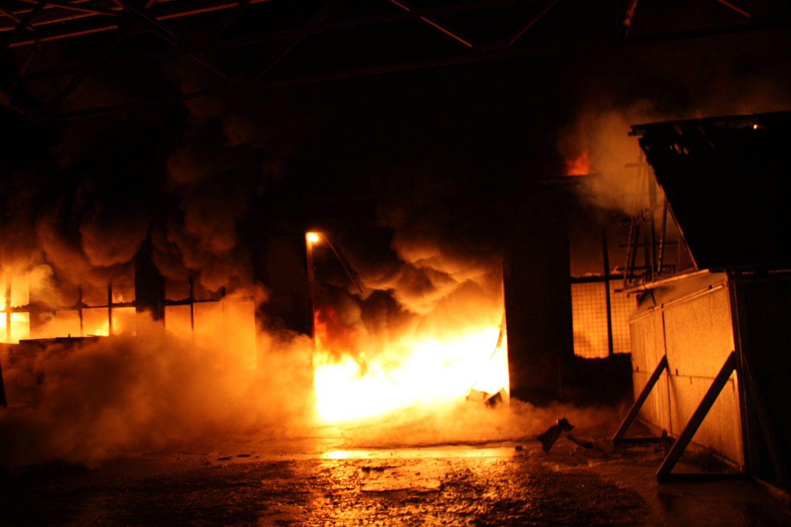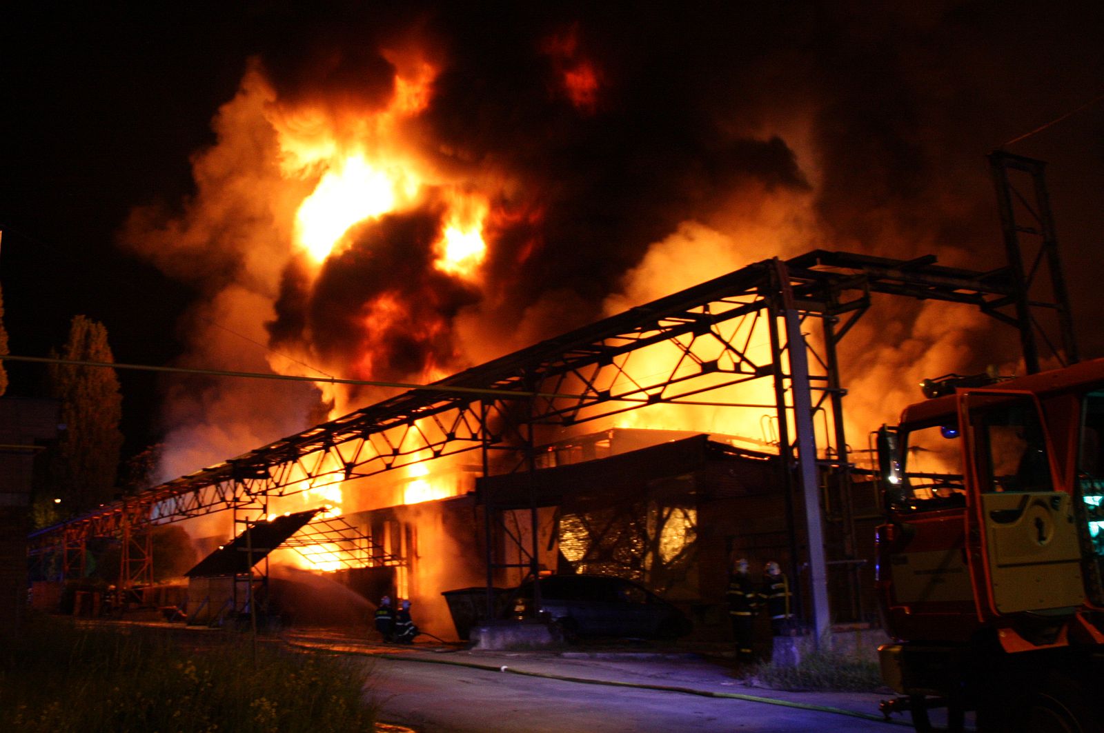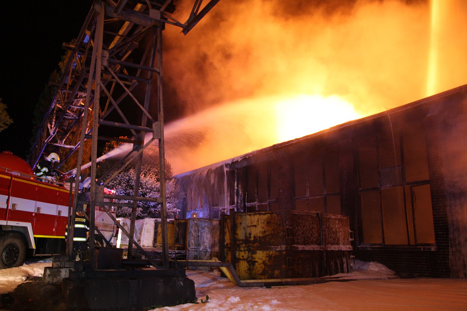 Po příjezdu prvních jednotek hasičů bylo zjištěno, že požár zasáhl prakticky celý jednopodlažní objekt o půdorysu asi 15 x 30 metrů. Plameny šlehaly vysoko nad střešní konstrukce a z objektu se postupně ozývaly výbuchy tlakových lahví. Hasiči byli nuceni ustoupit do bezpečné vzdálenosti a objekt hasit pouze z vnější strany. Vstup do vnitřních prostor byl naprosto vyloučen.