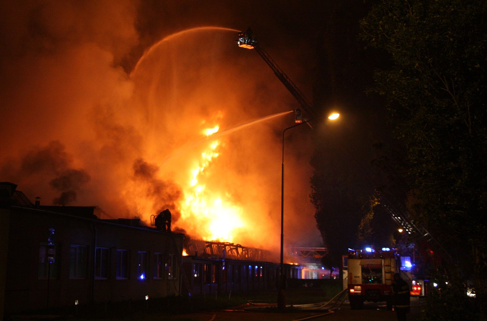 Téhož dne ve 22:16 hodin byl vyhlášen II. stupeň požárního poplachu a na místo zásahu byly vyslány další posilové jednotky. Do hašení byla postupně zapojena také výšková technika. Z košů čtyř automobilních žebříků se hasiči pokoušeli hasit zasažené střešní konstrukce a po jejich destrukci i vnitřní prostory objektu.