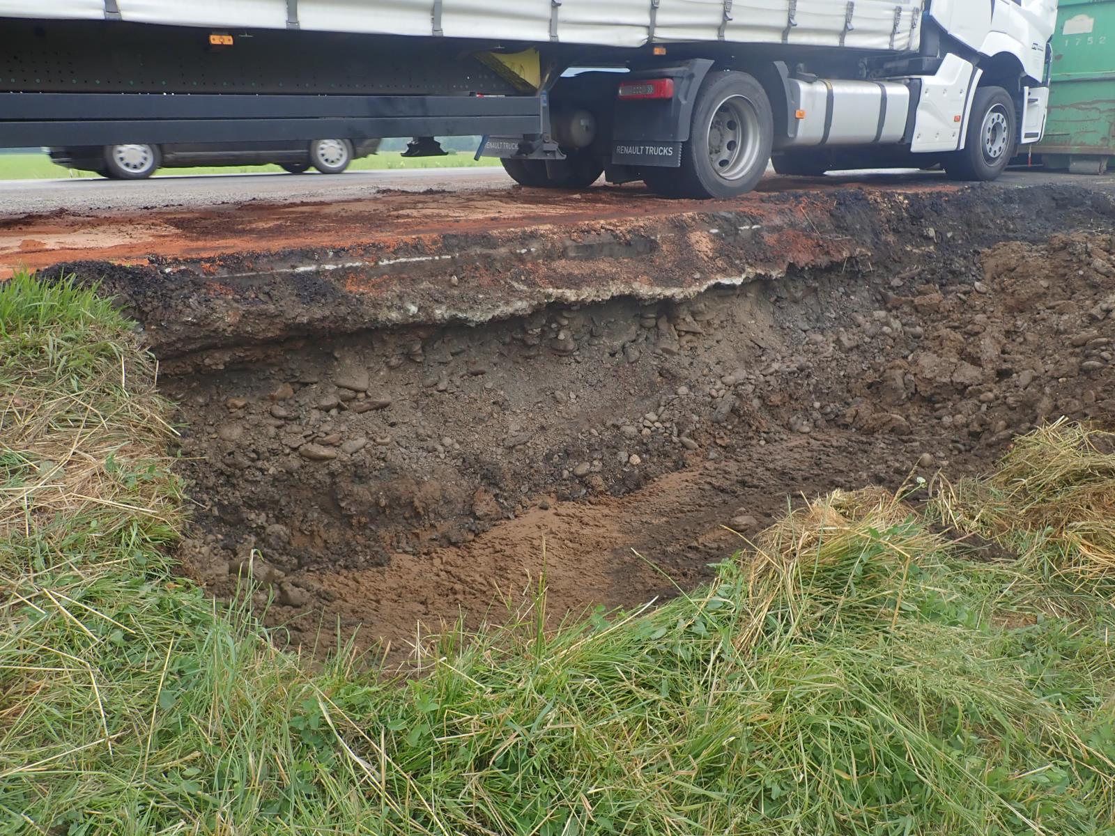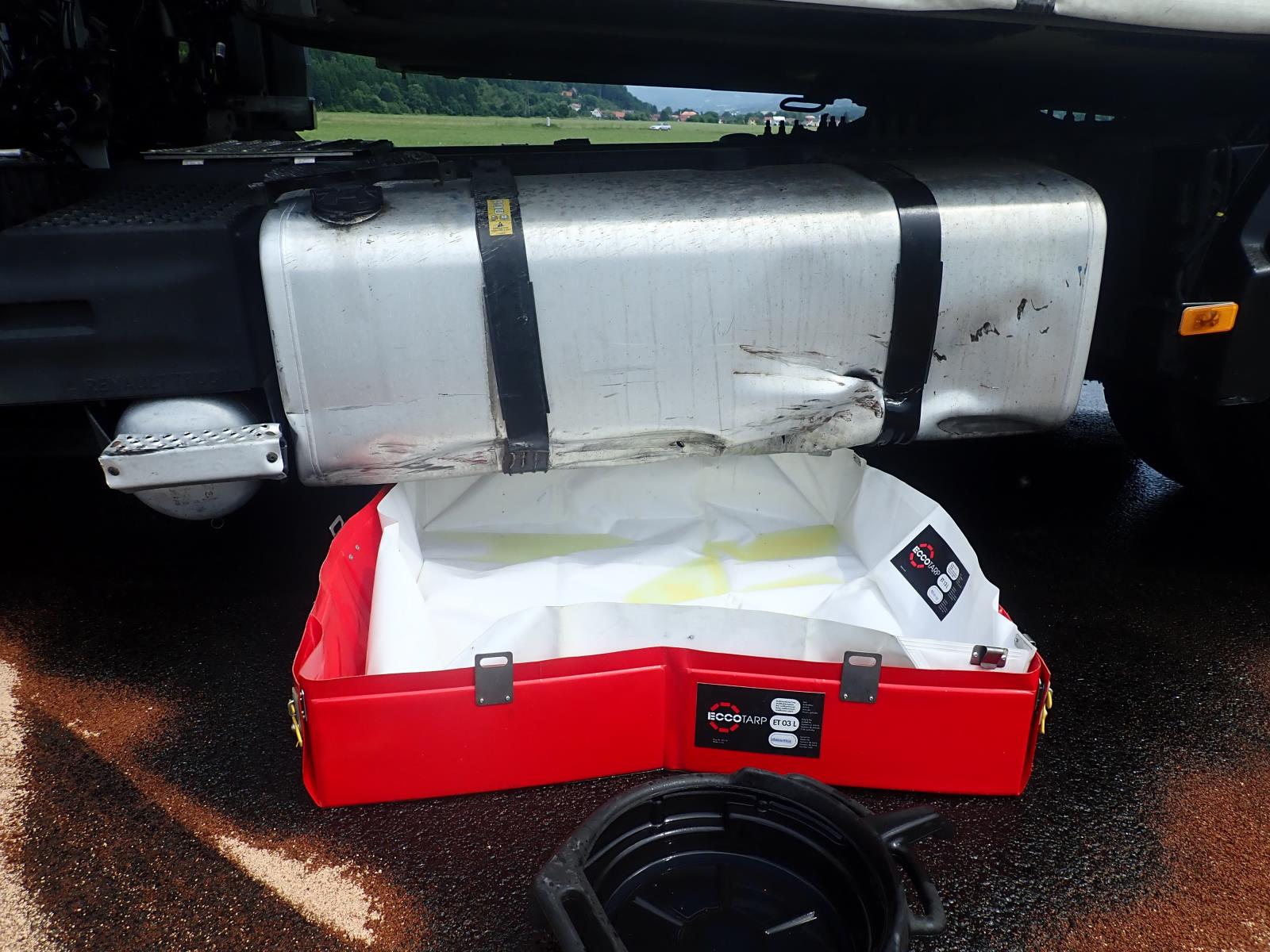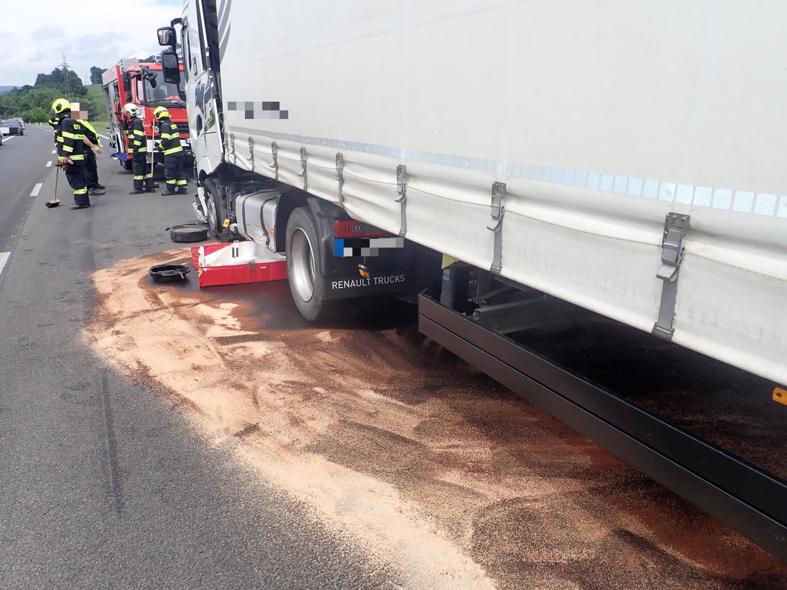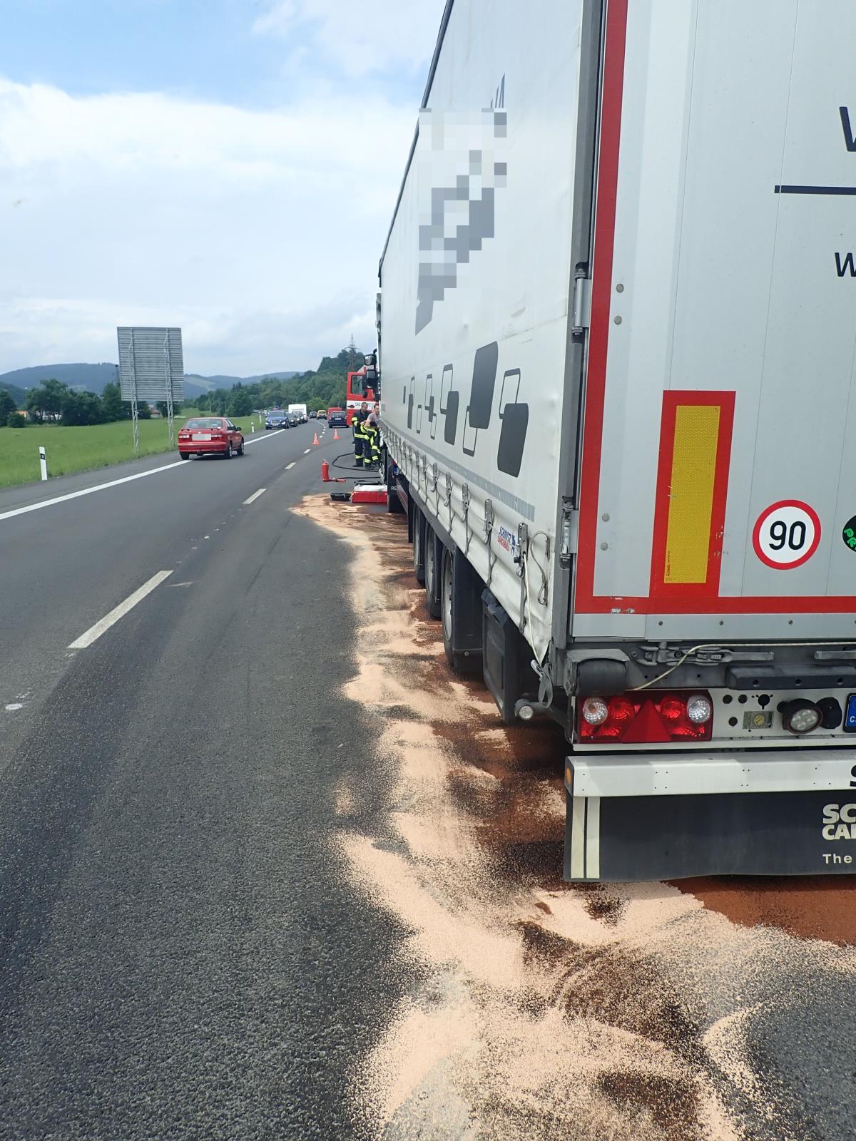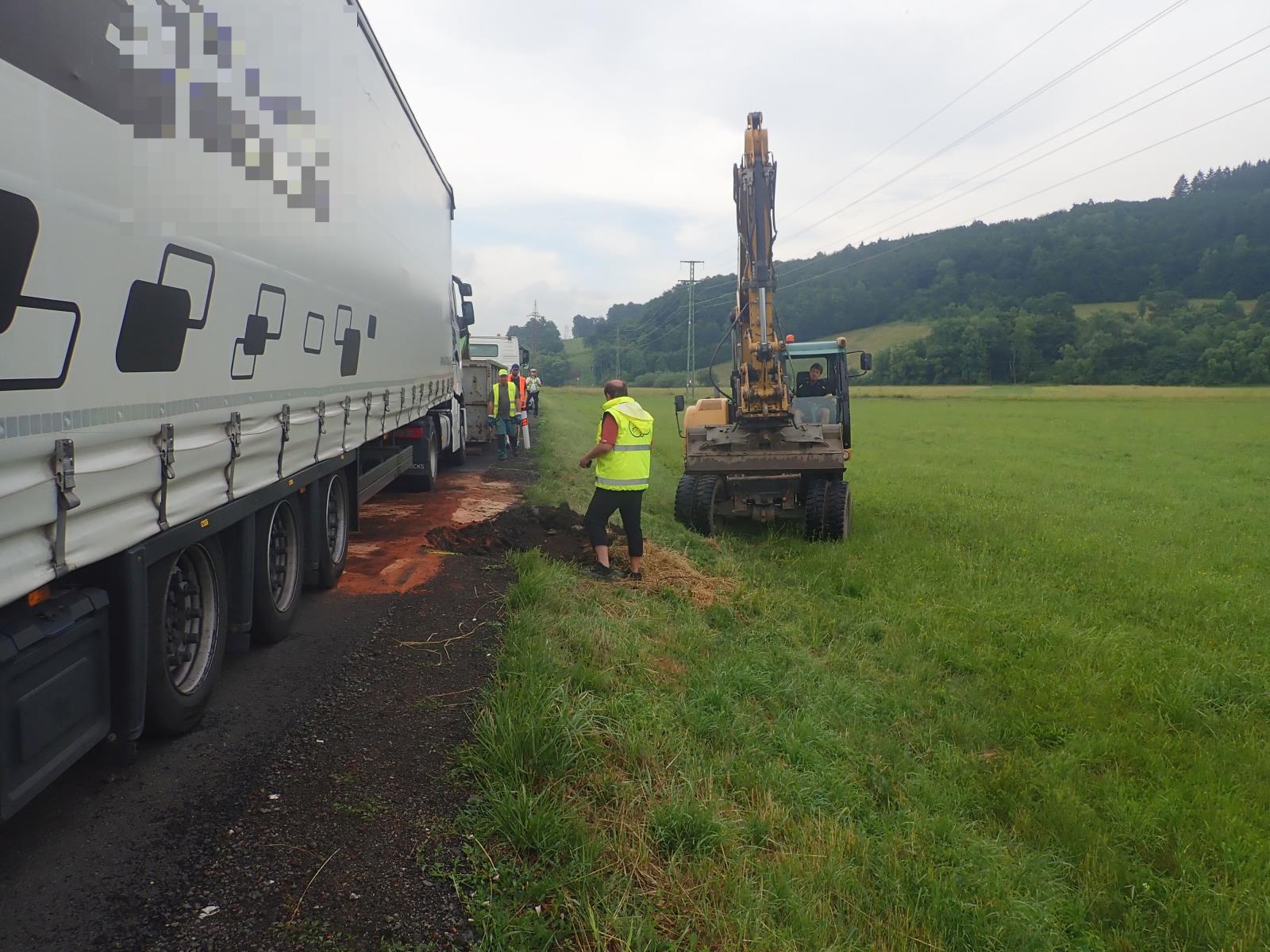Při nehodě došlo k proražení jedné palivové nádrže kamionu, ze které začala unikat nafta na silnici a do půdy na okraji vozovky.