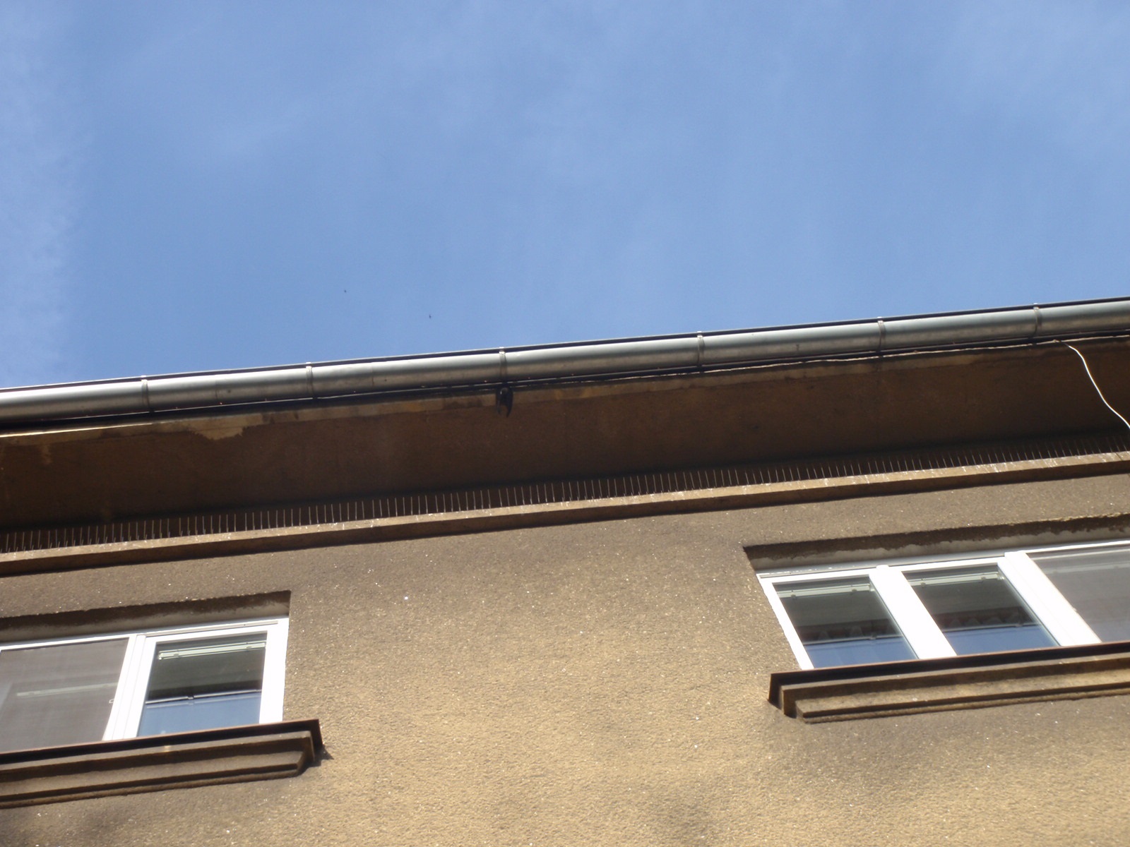 Vlaštovka se zachytila pod okapem bytového domu.