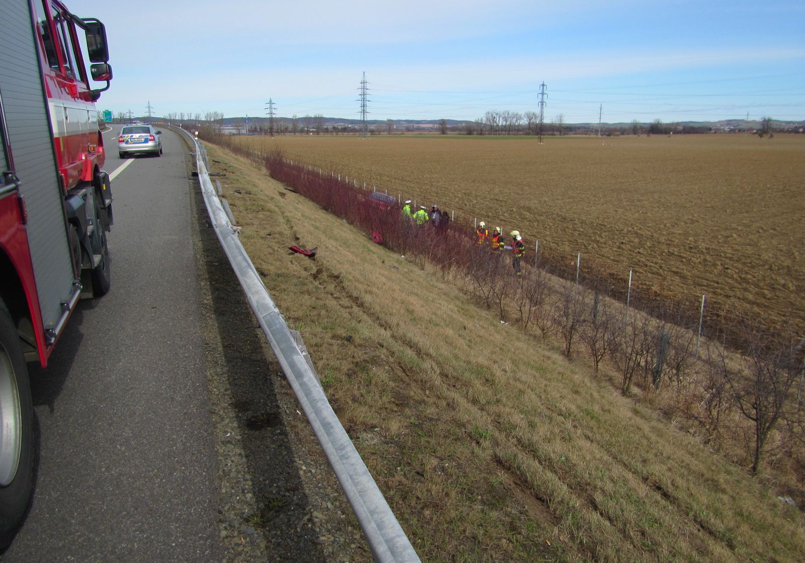 Osobní vozidlo sjelo z dálnice, pokračovalo v jízdě po příkrém svahu podél vnější strany svodidel do kterých následně narazilo a převrátilo se přes střechu. Po přetočení pak zůstalo stát na kolech pod úrovní dálnice. Ve vozidle cestovaly dvě dospělé osoby a dítě. Všichni vyvázli z události bez zranění. Z preventivních důvodů byla na místo povolána posádka zdravotnické záchranné služby, která všechny účastníky nehody zkontrolovala.