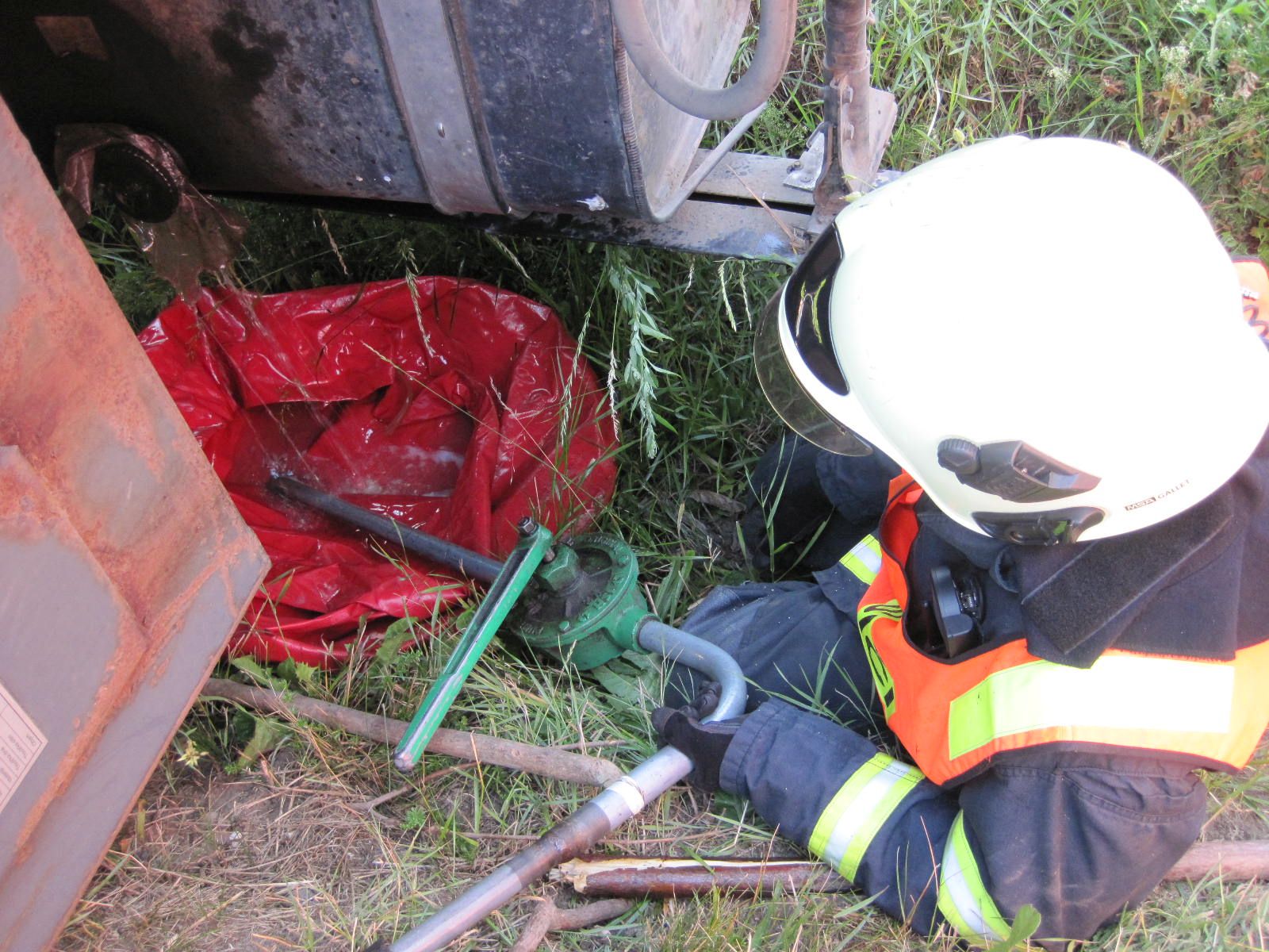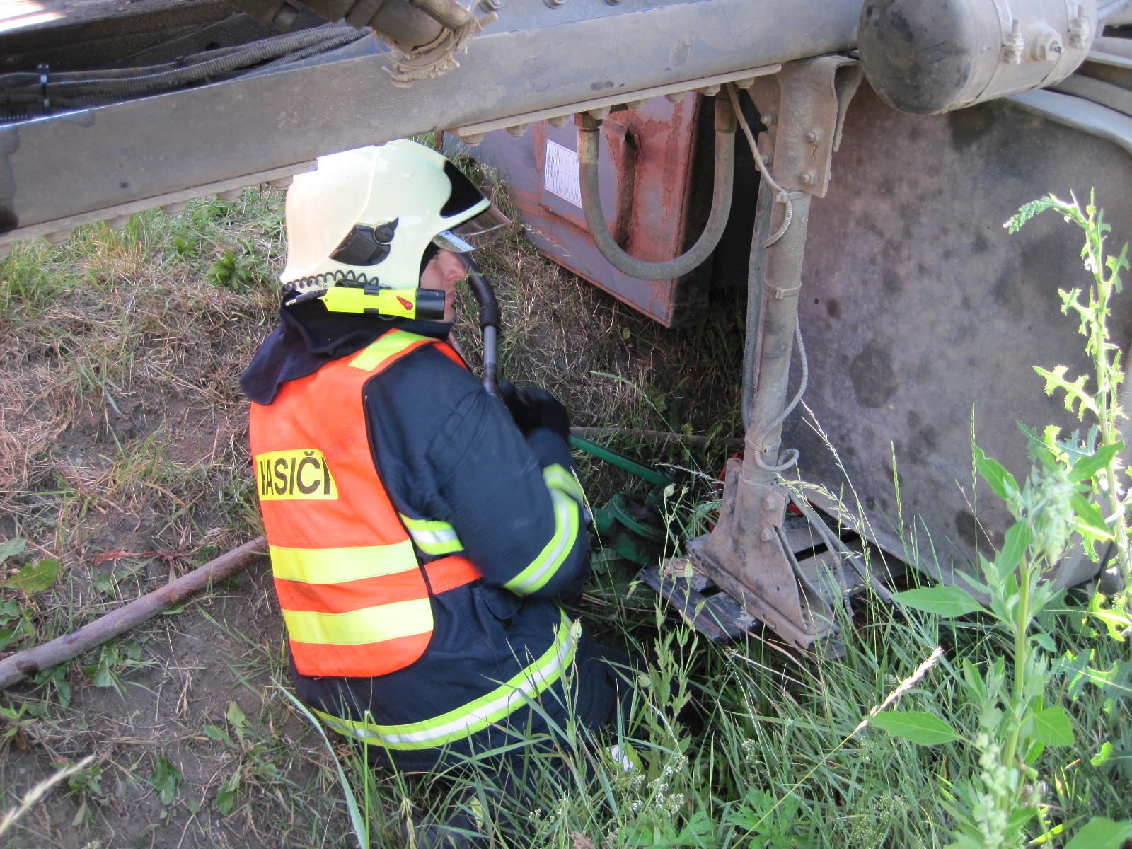 Nákladní vozidlo skončilo převrácené na boku a přes uzávěr nádrže unikala nafta. Tu hasiči zachytávali do připraveného vaku a následně ji přečerpávali do kanystrů. V 15:53 hodin byl únik zlikvidován. Vzhledem k tomu, že vozidlo nebránilo v provozu na komunikaci a nehrozilo žádné další nebezpečí ukončili hasiči svůj zásah a místo předali policistům.