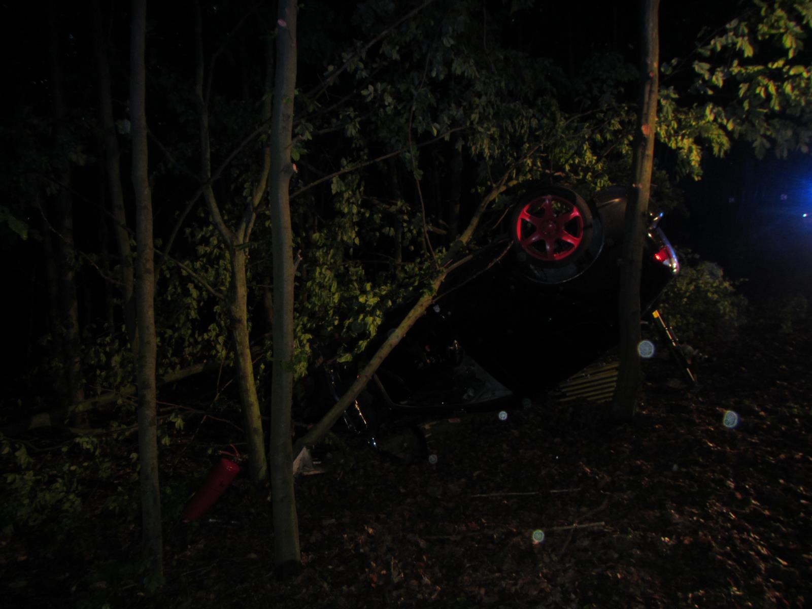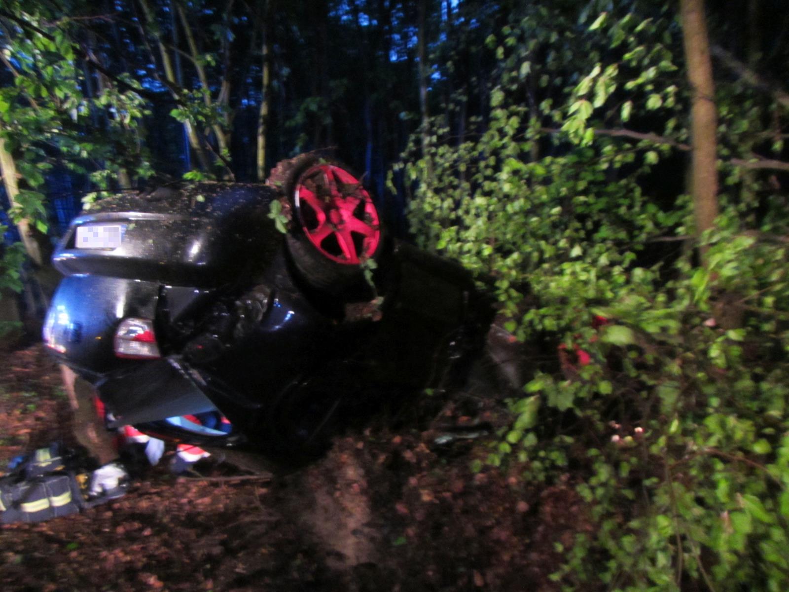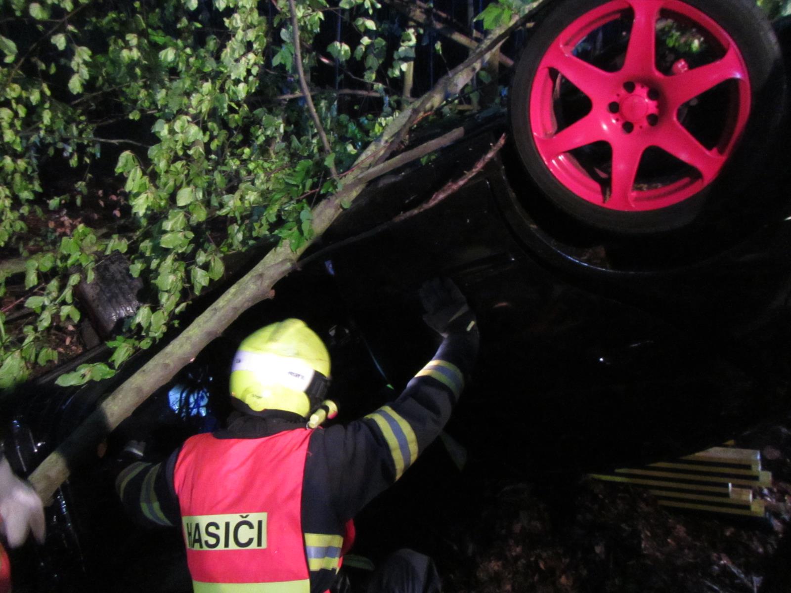Po příjezdu na místo hasiči průzkumem zjistili, že osobní vozidlo je na střeše mimo komunikaci. Řidič vozidla byl zaklínění uvnitř auta a spolujezdec se sám z vozidla dostal ven.