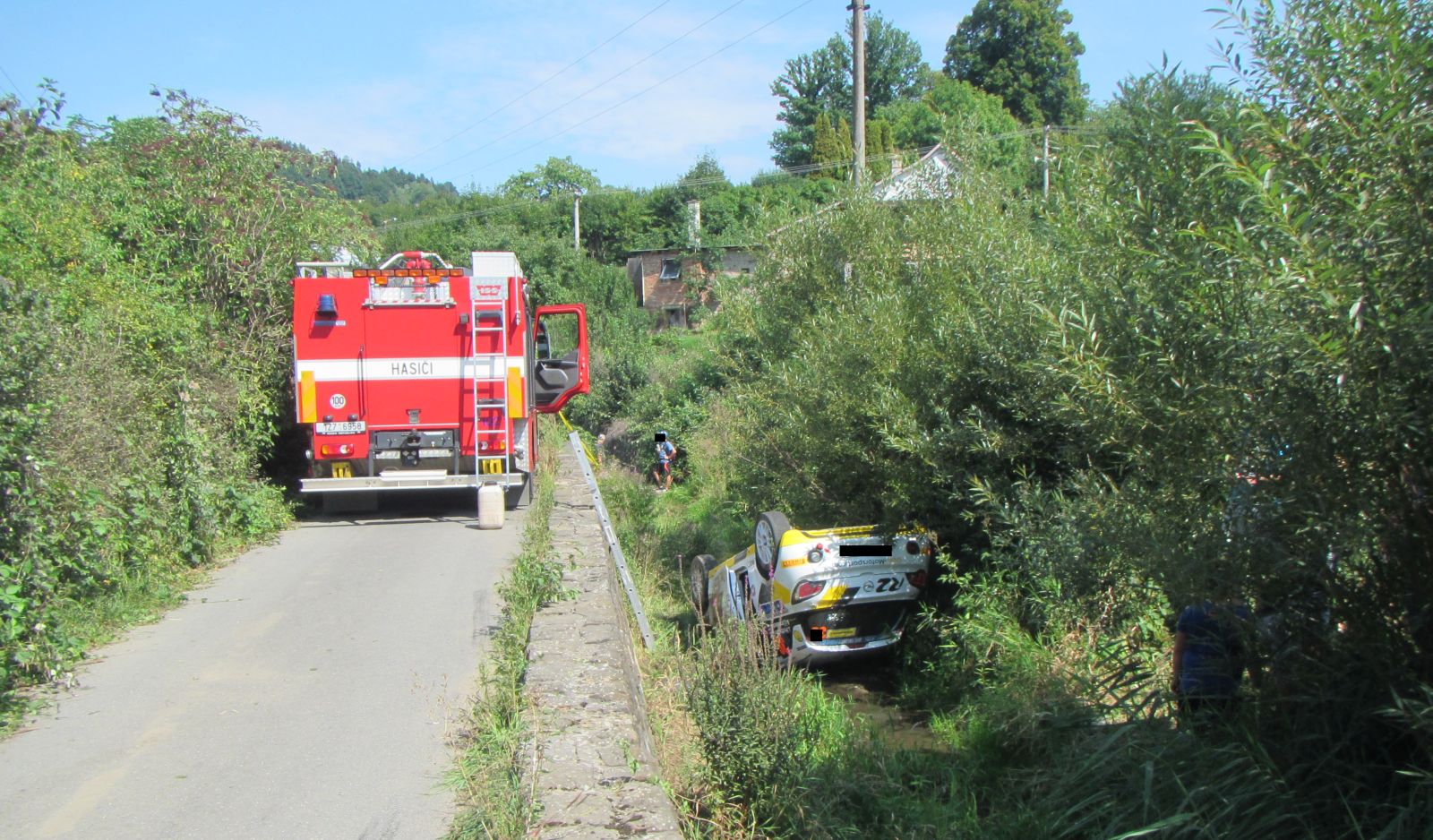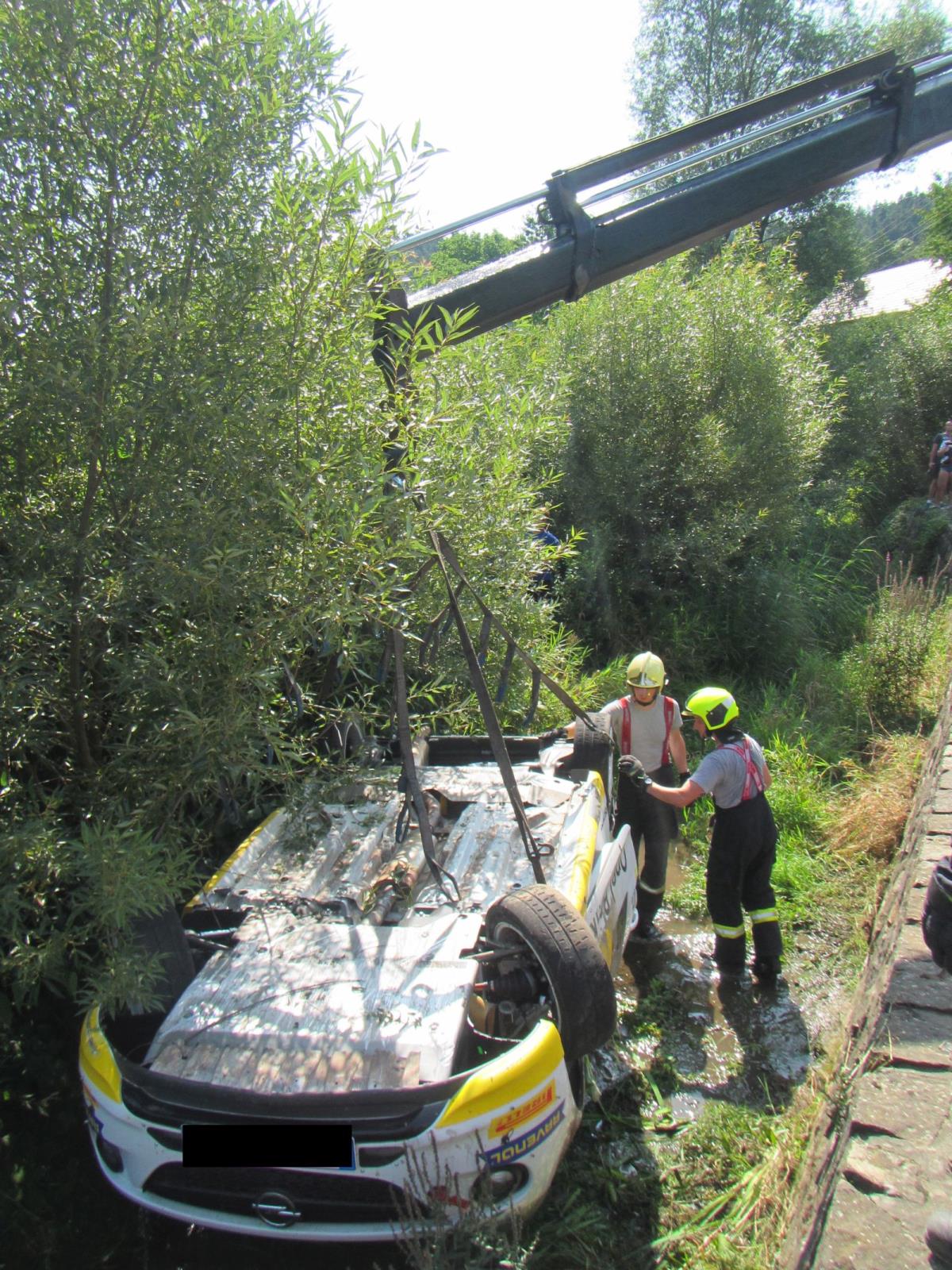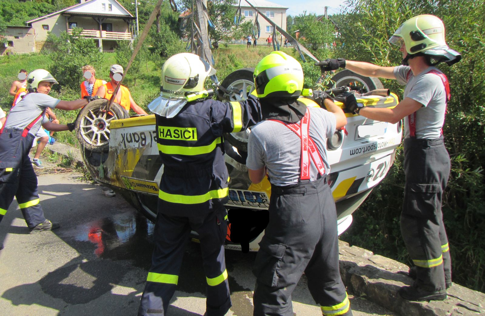 Závodní vozidlo skončilo převrácené na střeše v korytu potoka pod úrovní místní komunikace. Šíření olejové skvrny po hladině potoka hasiči zabránili položením sorpčních hadů a znečištěnou hladinu zasypali sorbenty. K vytažení havarovaného vozidla velitel zásahu povolal na místo události vyprošťovací automobil ze stanice Otrokovice. Jeho nasazení ale nakonec nebylo nutné. S vytažením vozidla hasičům pomohl automobil asistenční služby s hydraulickou rukou.