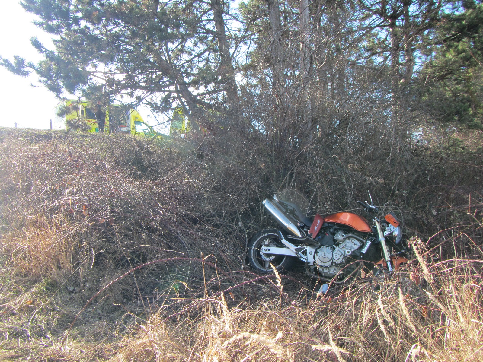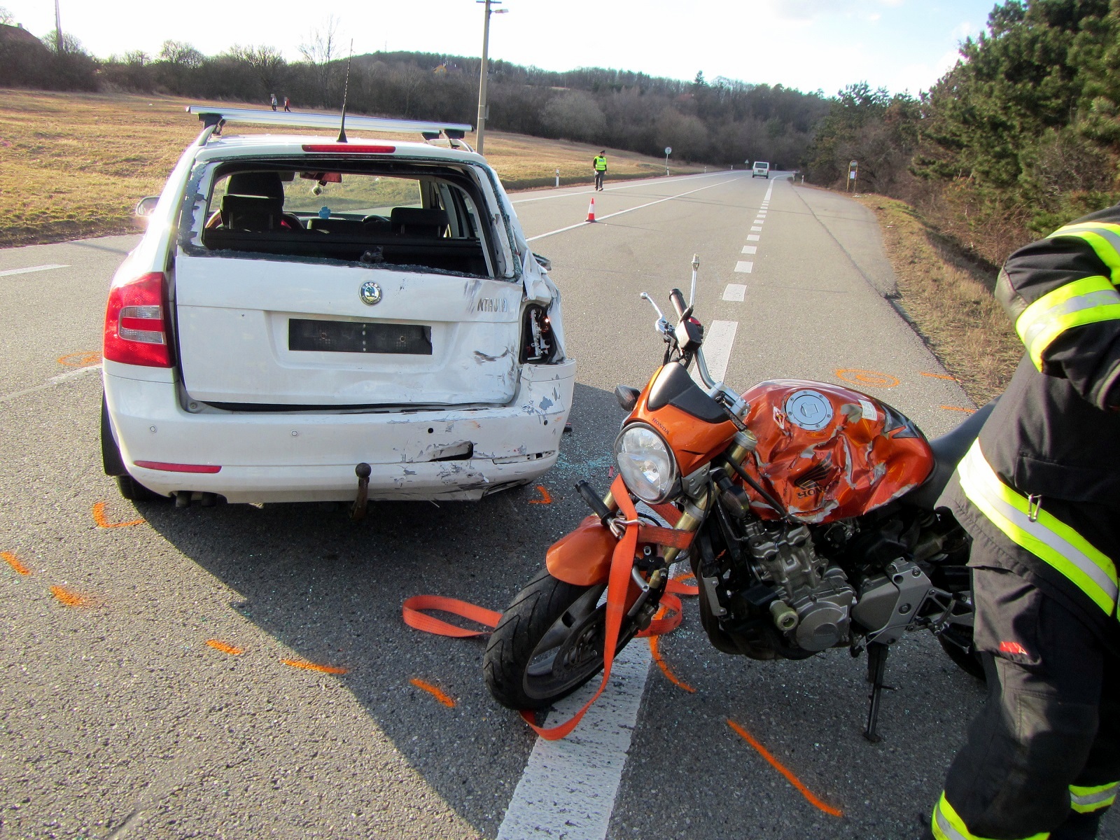 V době příjezdu se již na místě nacházela posádka zdravotnické záchranné služby. Jak bylo zjištěno, došlo zde ke střetu motocyklu Honda s osobním automobilem Škoda Octavia. Při nárazu došlo ke zranění motocyklisty, který byl naložen do vakuových nosítek a byl letecky transportován do nemocnice. V době nehody byl provoz komunikace zastaven.