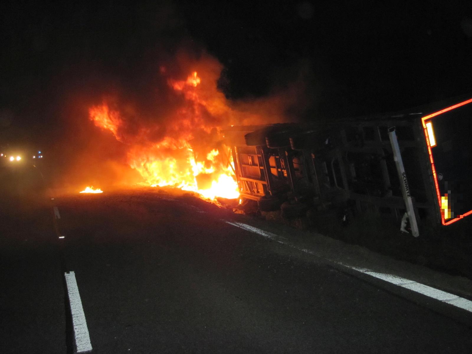 (4.6.2019) Dnes krátce před jednou hodinou v noci se převrátil na silnici I/50 u Bystřice pod Lopeníkem ve směru na Bánov kamion do příkopu a začal hořet. Oznamovatel na tísňové lince sdělil, že hoří celá kabina i návěs.