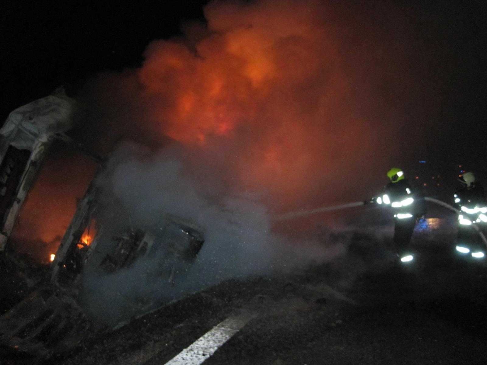 Po příjezdu první jednotky k místu požáru byl celý kamion v plamenech. Hasiči ihned začali hasit kamion pomocí dvou C proudů hasební vody s pěnou. V době zásahu hasičů byla komunikace obousměrně uzavřena. Krátce před půl druhou měli hasiči požár pod kontrolou. O hodinu později byl požár kamionu uhašen. Díky tomu mohl být zprůjezdněn jeden jízdní pruh, ve kterém policisté řídili dopravu kyvadlově.