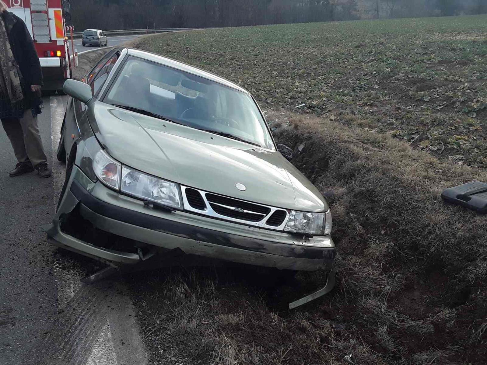 Vůz skončil po nehodě mimo komunikaci v příkopu. Při nehodě se lehce zranila jedna osoba a skončila v péči zdravotníků.