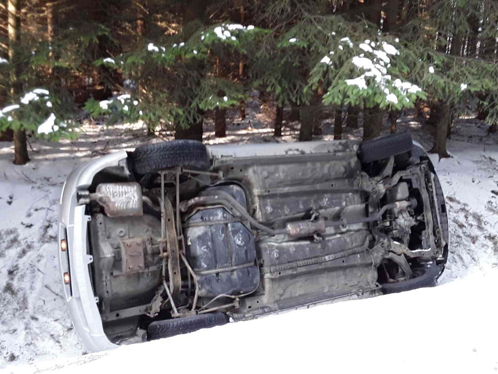 Vůz skončil po nehodě převrácený na boku mimo komunikaci. Nehoda se obešla bez zranění osob.
