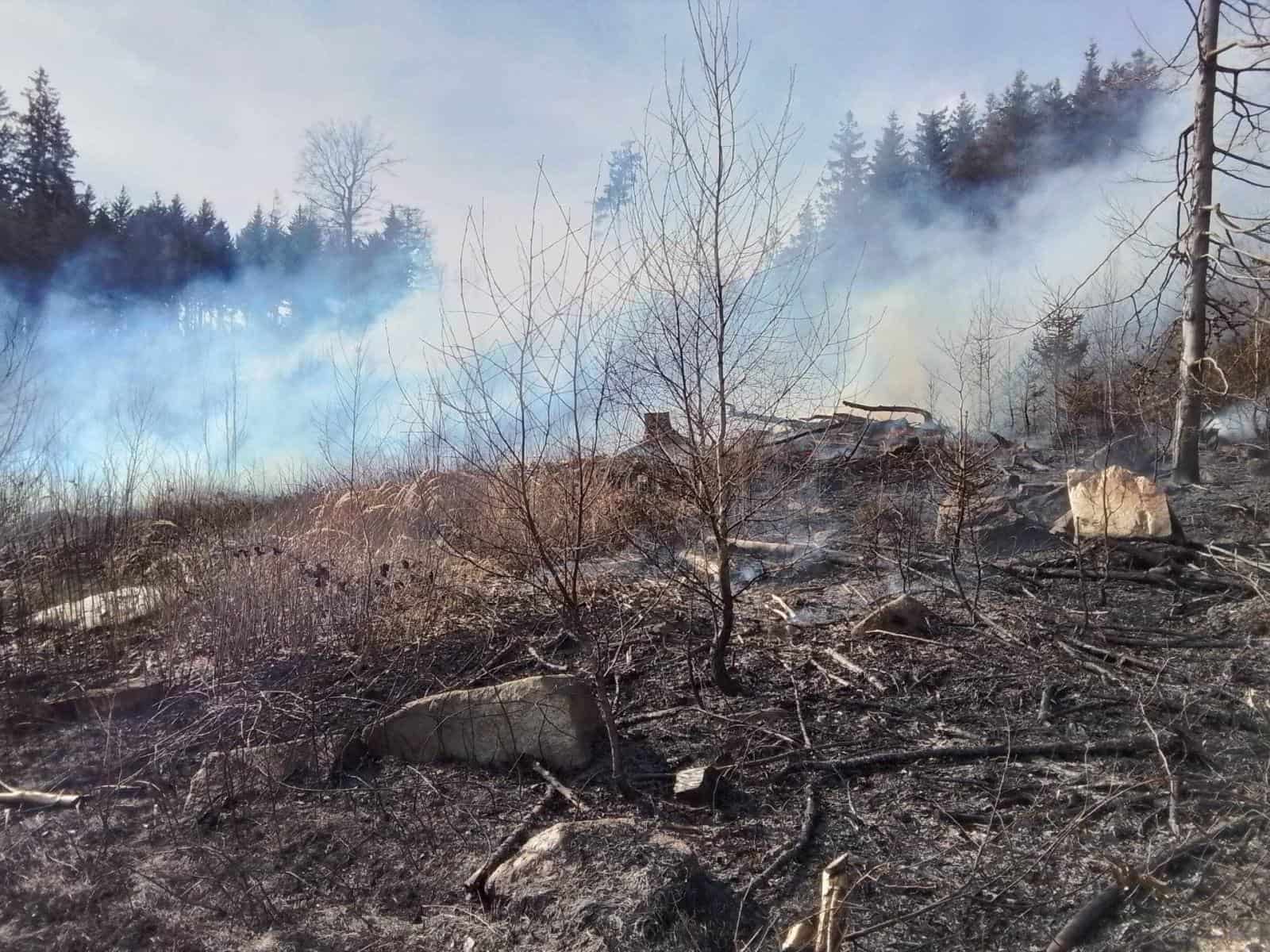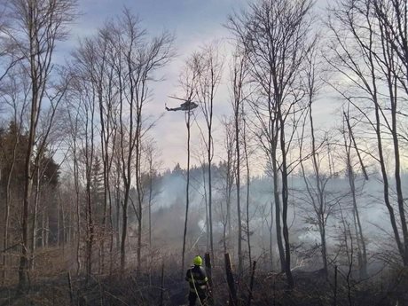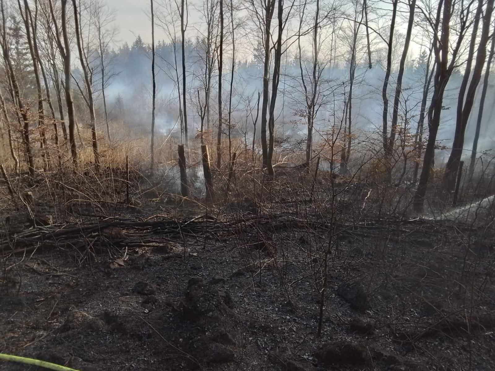 Požár v mladém lesním porostu vyvolal nasazení profesionálních i dobrovolných hasičů. Zásah komplikoval vítr i obtížně přístupný terén. K hašení musela být povolána také letecká hasicí služba.