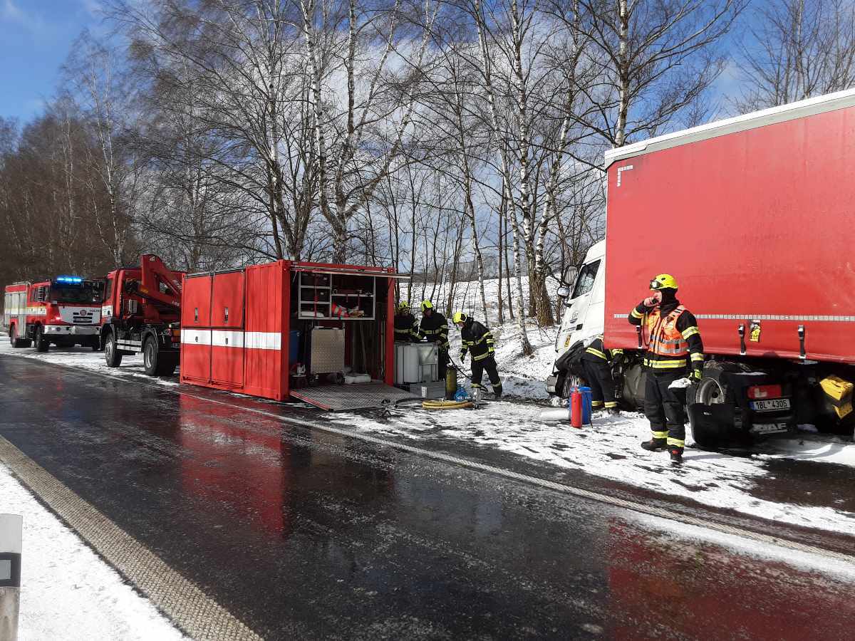 Při nehodě nákladního vozidla u Pravíkova došlo k masivnímu úniku nafty