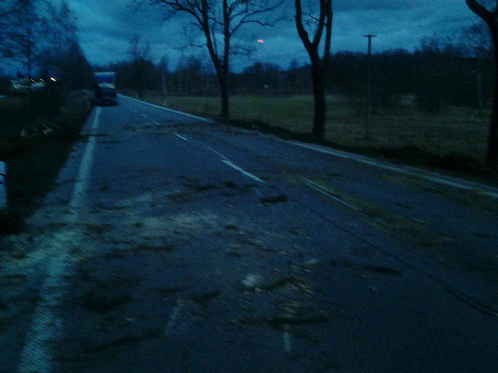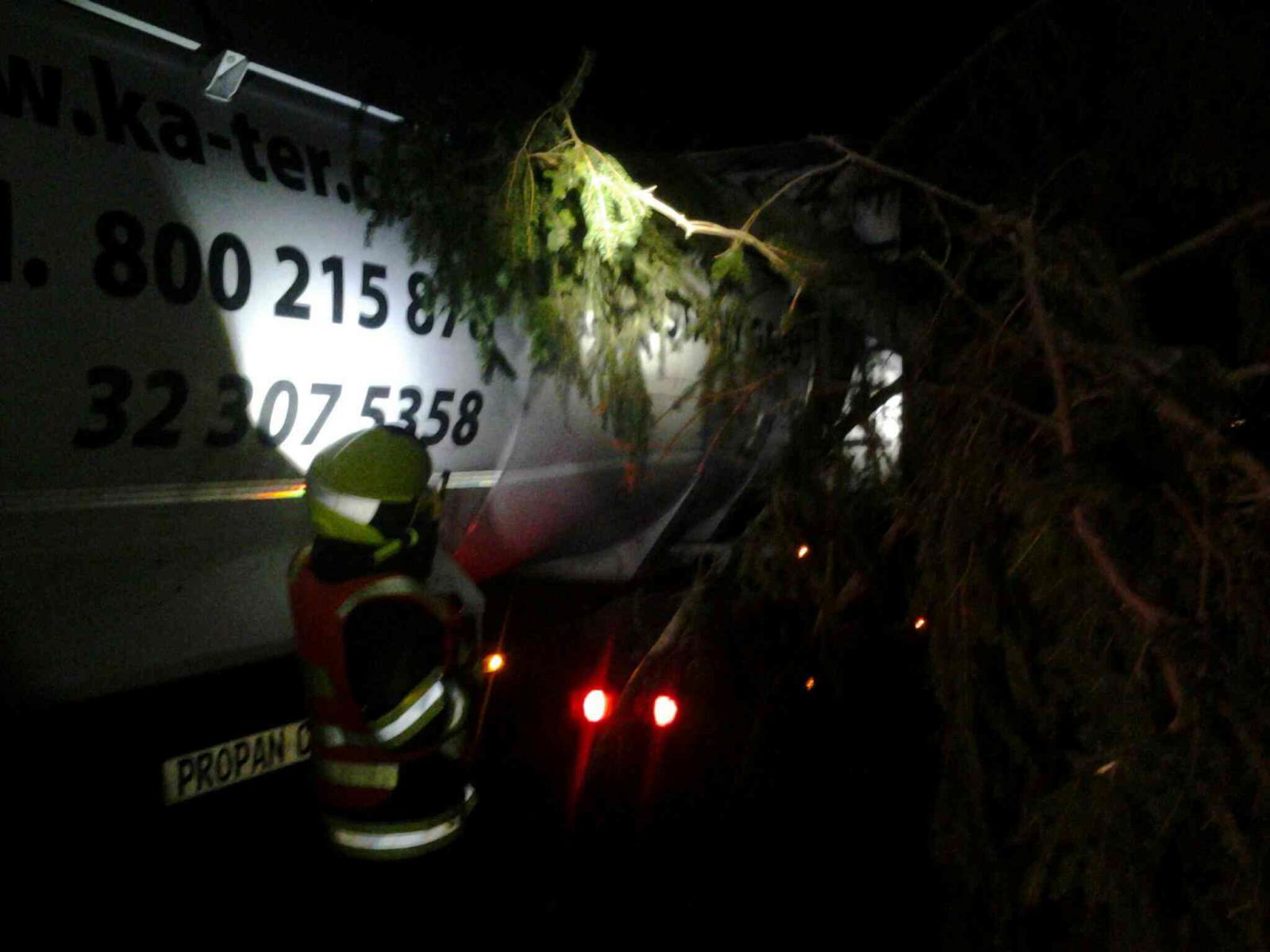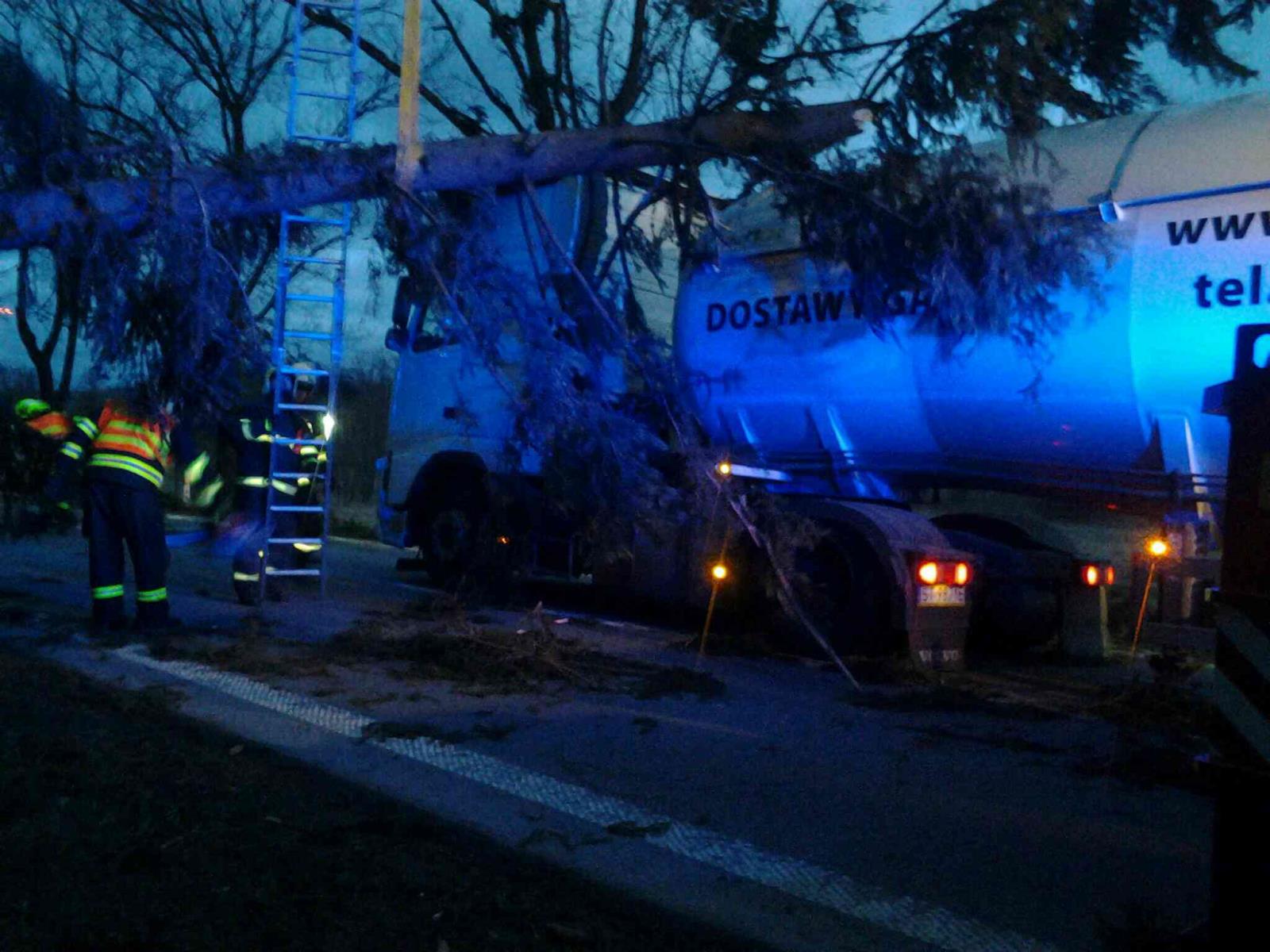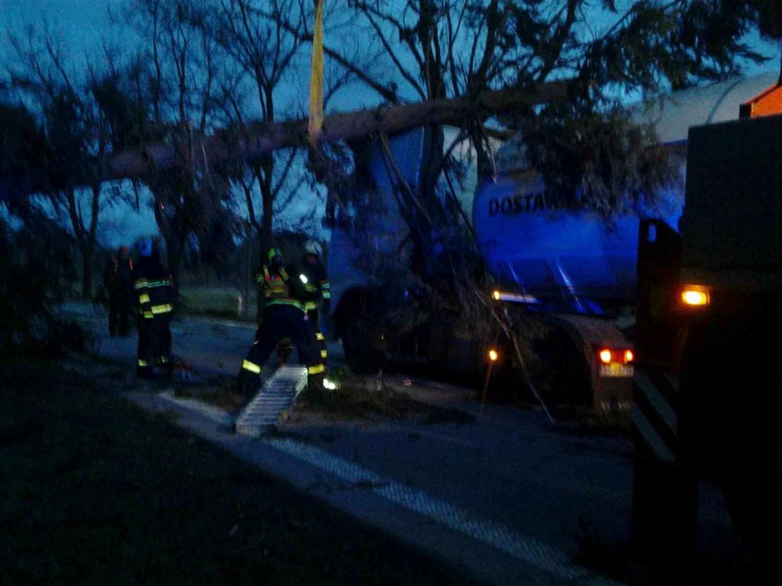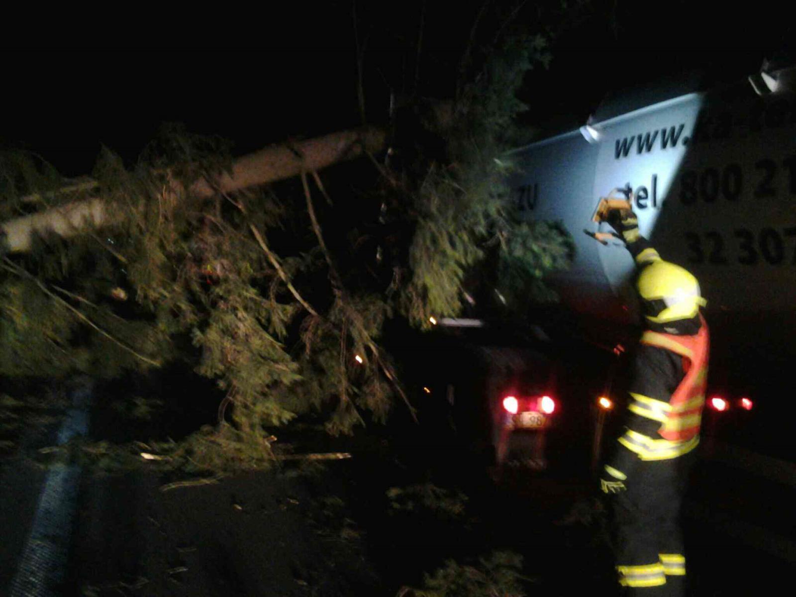 V 05,04 hod vyjeli profesionální hasiči ze stanic v Pacově a Pelhřimově na komunikaci spojující Obrataň a Kámen, kde padly stromy na nákladní vůz a cisternu. Událost se obešla bez zranění osob. Hasiči stromy odklidili. Před sedmou hodinou ráno byla komunikace v místě plně průjezdná.