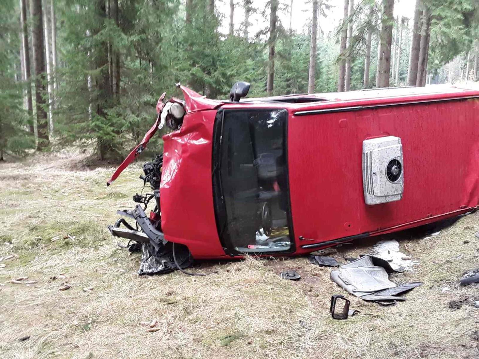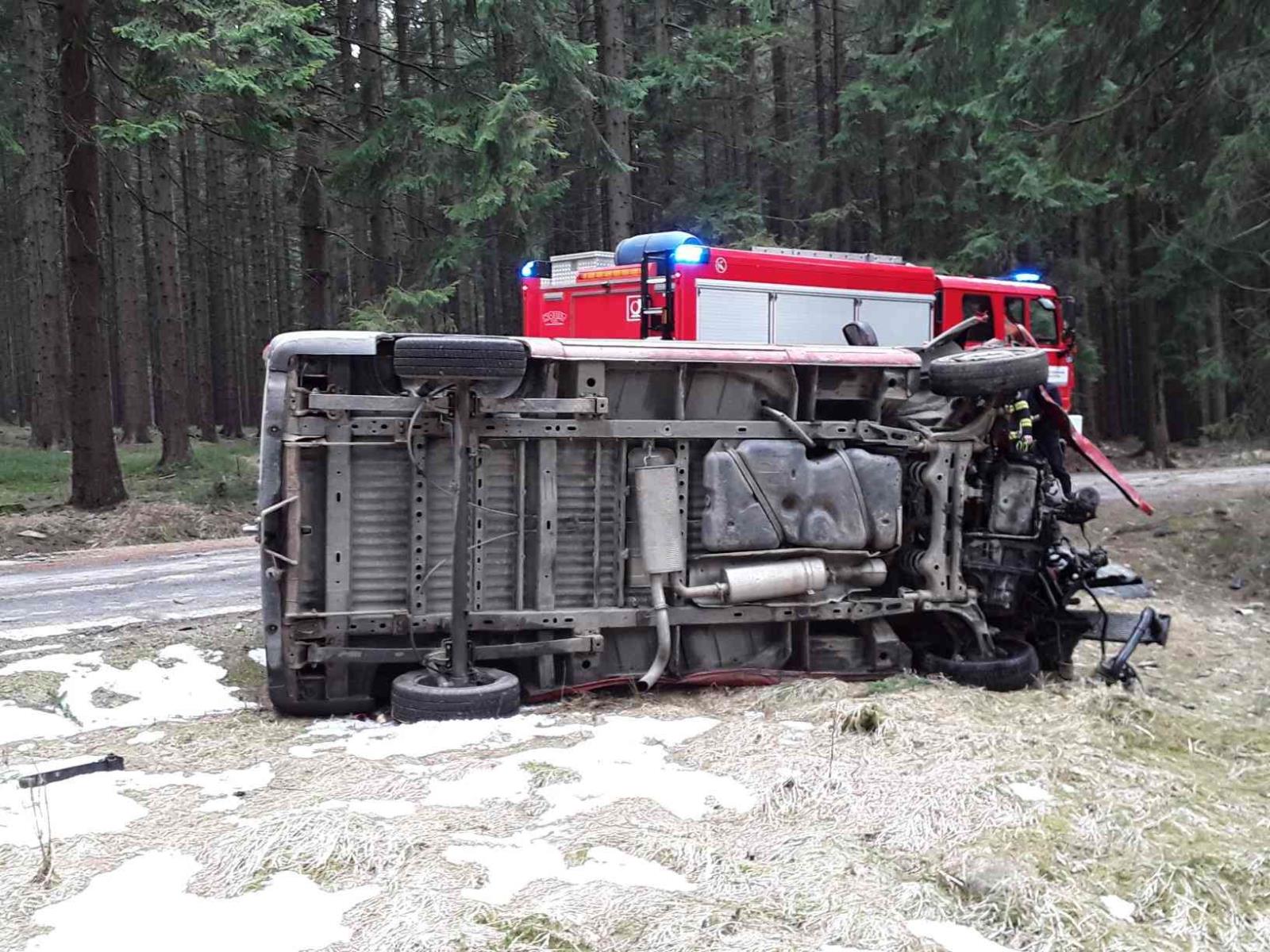 Dodávka skončila po nehodě převrácená na boku. Při nehodě se zranil řidič vozidla a skončil v péči zdravotníků.