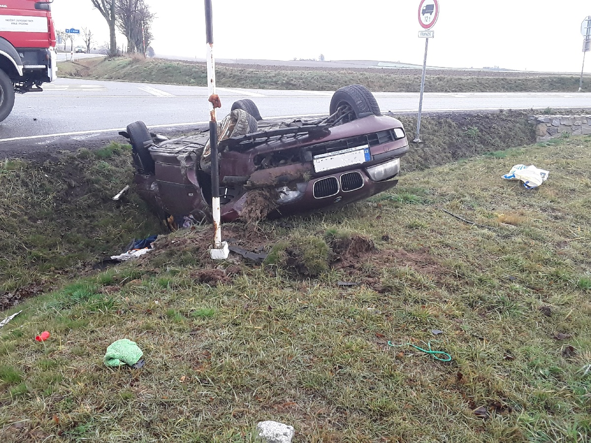 Jedno z vozidel skončilo po nehodě převrácené na střeše. Nehoda si vyžádala jedno zranění.