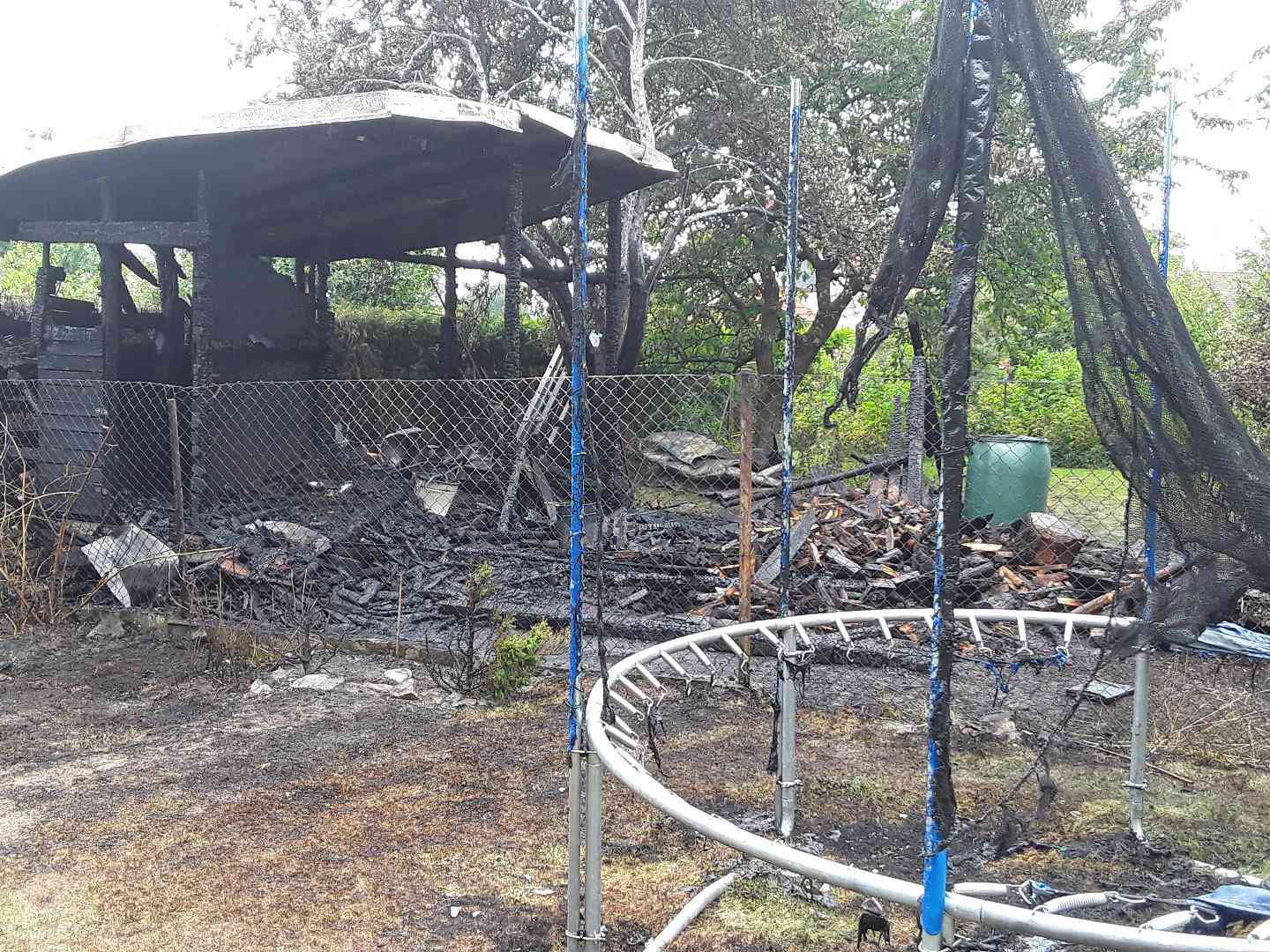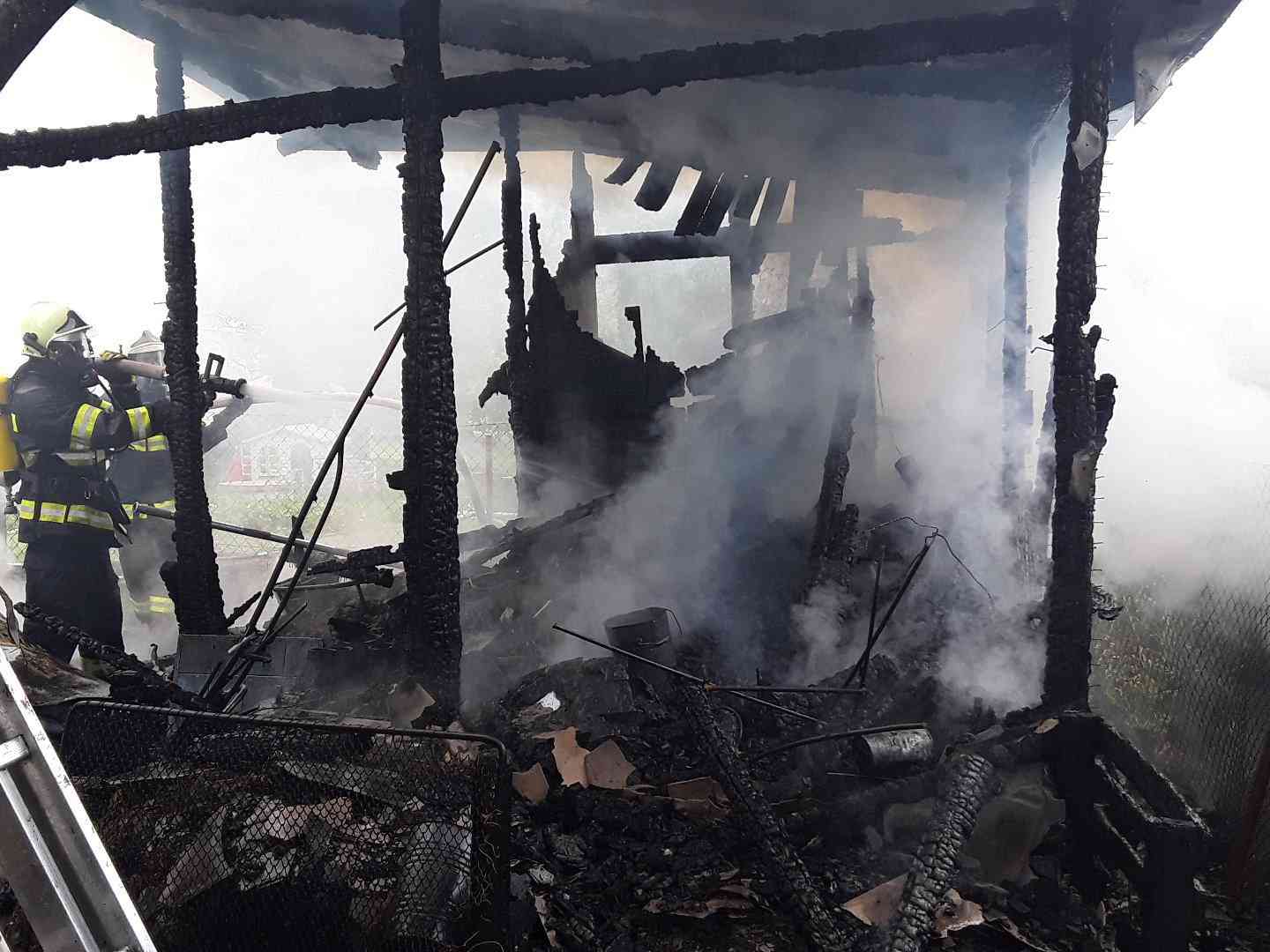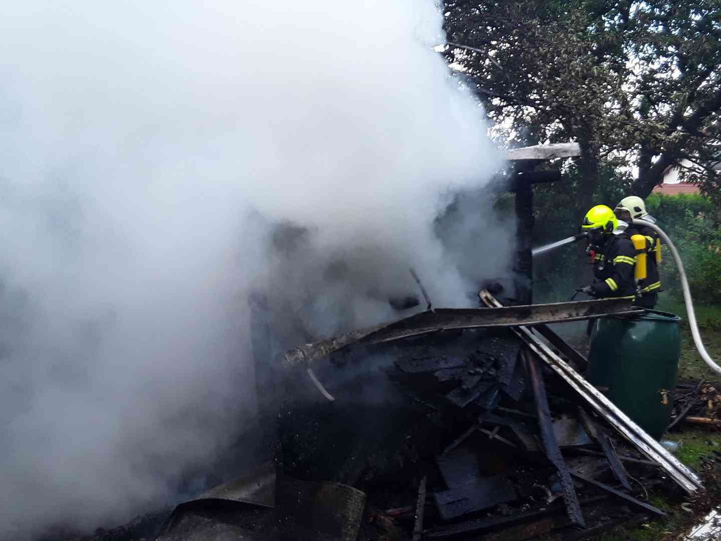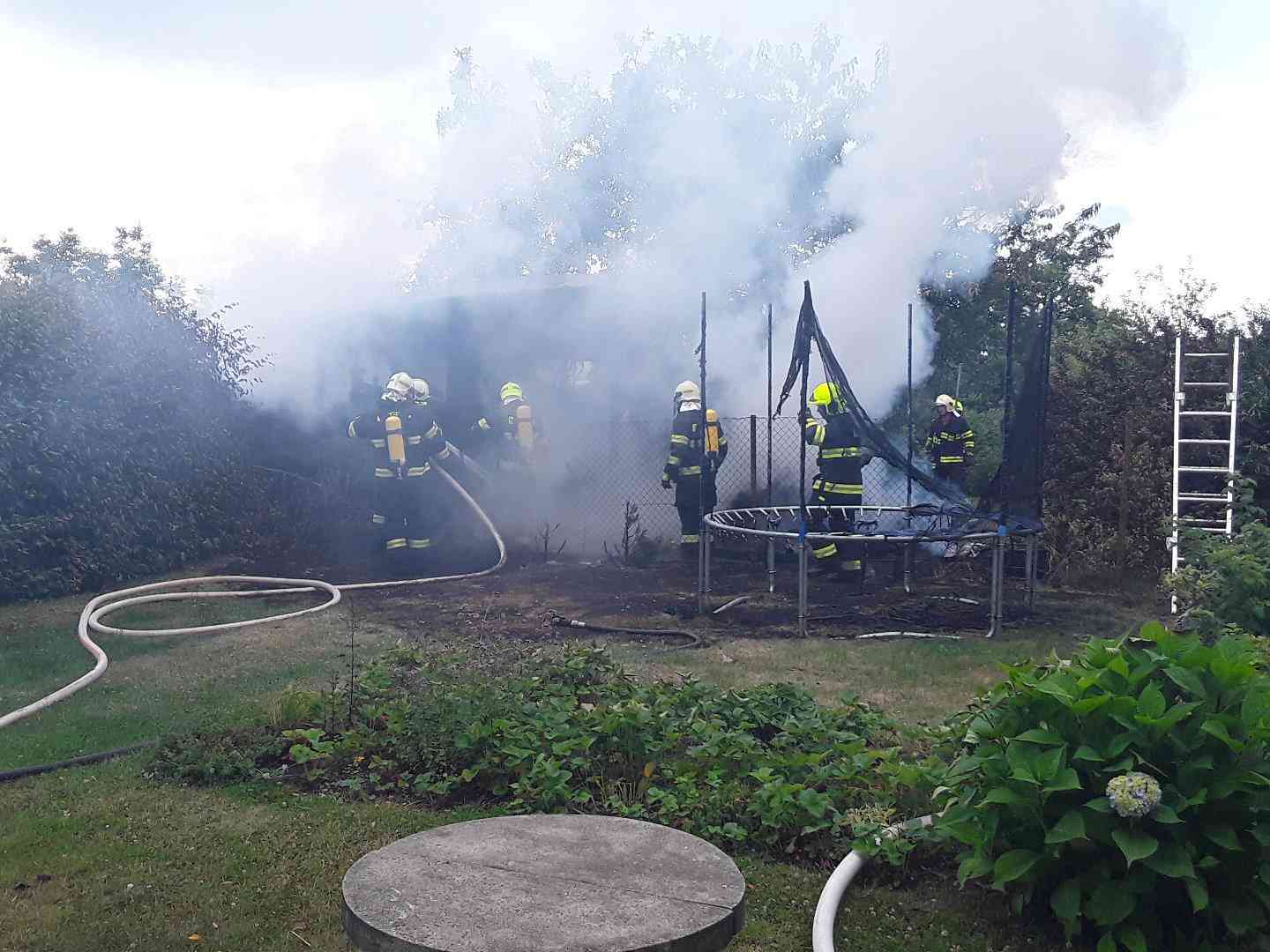 Požár, který zasáhl zahradní domek s dřevníkem, trampolínu a okrasné dřeviny, se hasičům podařilo dostat pod kontrolu po několika minutách intenzivního hašení.