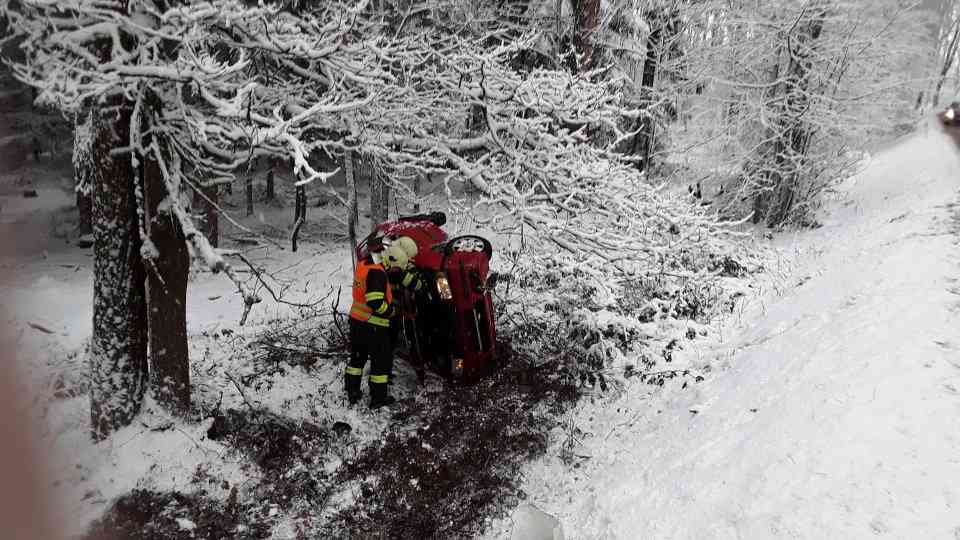 Vůz skončil po nehodě převrácený na boku mimo komunikaci v příkopu. Nehoda se obešla bez zranění osob. Hasiči provedli na havarovaném vozidle protipožární opatření a místo události technicky zabezpečili.
