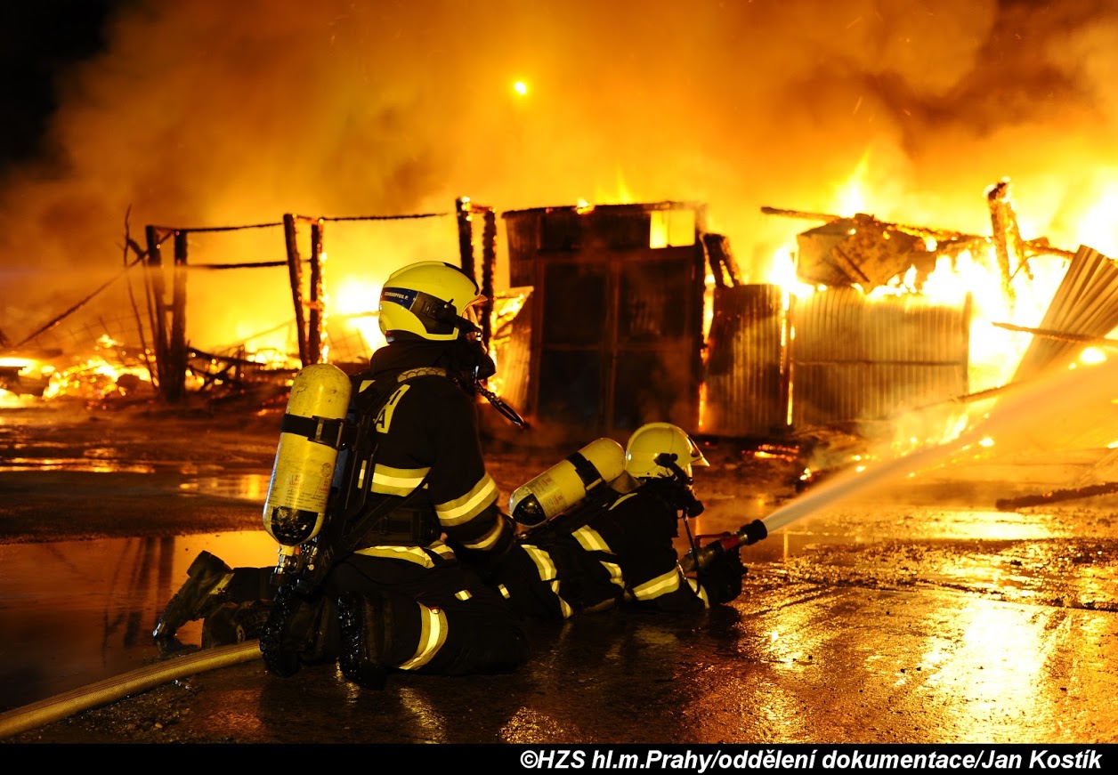Deset jednotek hasičů zasahovalo 24.08.2017 od 00:46 hodin u požáru haly v ulici Nad Vršovskou horou v Praze 10. Hala o rozměrech asi 60x20 metrů byla po příjezdu prvních jednotek zachvácena plamenným hořením v plném rozsahu. Hasiči pracovali v dýchací technice pomocí 11 C proudů, dva proudy byly vedeny po žebříku a plošině. S ohledem na náročnost zásobování místa požáru vodou bylo asi 300 metrů od objektu zřízeno čerpací stanoviště z podzemního hydrantu. Hasiči se mimo samotné hašení haly soustředili i na ochranu okolních objektů. Objekt se nachází v hlídaném oploceném areálu v blízkosti dalších průmyslových budov. Před halou, která slouží jako autodílna, byly zaparkovány dva nákladní automobily, které byly požárem zničeny. Sálavé teplo poškodilo plastové části dalších automobilů stojících v okolí haly. Jednotky pracovaly také se zařízením COBRA, pomocí kterého se dostaly pod střešní konstrukci vedlejšího objektu, který byl požárem částečně zasažen. S ohledem na rozsah požáru a počet zasahujících jednotek byl vyhlášen druhy stupeň požárního poplachu. Hasiči-chemici prováděli během zásahu měření koncetrací škodlivin, které unikaly do ovzduší. Jejich koncetrace nepřekročila nebezpečnou mez. Povětrnostní podmínky navíc příznivě ovlivnily rozptyl zplodin hoření mimo obytnou část v okolí místa požáru. Před čtvrtou hodinou ranní na místě zůstávají jednotky na dohašování ohnisek požáru pod částečně zničenou konstrukcí haly. V 04:37 hodin pracovali hasiči na dohašení ohořelých zbytků haly pomocí 6 C proudů. Několik jednotek SDH bylo od 01:00 hodin připraveno jako záloha za jednotky, které zasahovaly na místě požáru. Od rána stále pokračují dohašovací práce. Vyšetřovatelé se na místo vrátí v dopoledních hodinách. Zdroj: Martin Kavka – tiskový mluvčí HZS Praha, Foto:HZS Praha