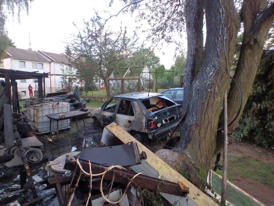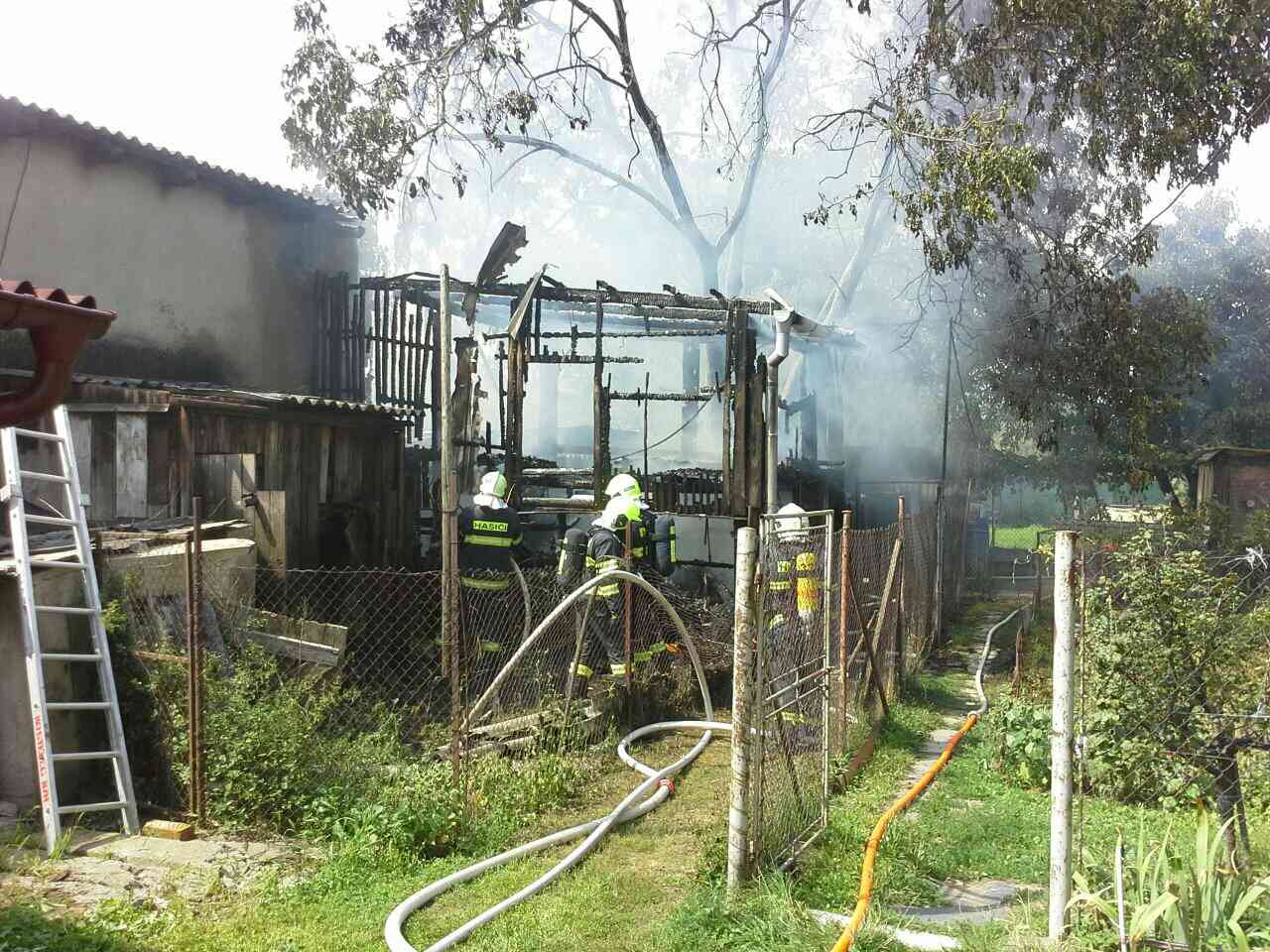 Požár kovové nástavby vozidla AVIA, upravené na dílnu a sklad. Oheň se následně rozšířil na dřevěnou garáž a také na další dřevěné přístavky.