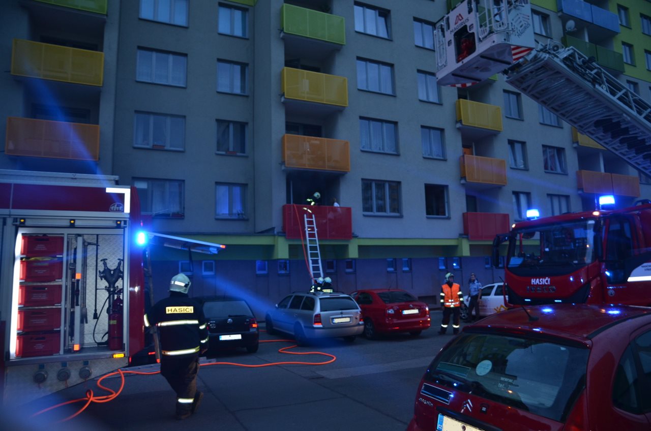Ve středu 2. srpna v 5:24 hodin přijala operátorka tísňové linky HZS Středočeského kraje informaci o požáru bytu v Hřebečské ulici v Kladně, kde v sedmipatrových domech bydlí mnoho invalidních osob. K události vyjela profesionální jednotka z centrální kladenské stanice se dvěma cisternovými vozy a automobilovým žebříkem. Na pomoc vyrazily i dvě cisterny dobrovolných hasičů obcí Hřebeč a Unhošť. První jednotka byla na místě sedm minut od ohlášení události. Jak se ukázalo, hořelo v kuchyni v prvním patře panelového domu. Lehce zraněná majitelka, která byla zřejmě intoxikována zplodinami hoření, seděla na vozíčku na balkoně a byla v péči sousedky. Ta duchapřítomně přelezla po římse z vedlejšího bytu a jako první pomohla hendikepované ženě. Zároveň neváhala a zmírnila rozvoj požáru, když plameny na kuchyňské lince zasypala zeminou z truhlíků, které měla majitelka bytu na balkoně. Obě ženy byly zachráněny pomocí koše automobilového žebříku. Zraněnou paní si následně převzala posádka zdravotnické záchranné služby a převezla ji do kladenské nemocnice. Hasiči v dýchací technice požár lokalizovali za několik minut vysokotlakým proudem a v 5:48 hodin nahlásil velitel zásahu jeho likvidaci. Po vyvětrání byt za přítomnosti Policie ČR předali správci objektu. Přímé škody vyčíslil vyšetřovatel částkou 50 tisíc korun, rychlým zásahem a nasazením potřebného počtu sil hasiči uchránili hodnoty za půl milionu, příčinou vzniku požáru bylo vznícení potravin na sporáku. Zdroj: por. Ing. Ladislav Holomčík, tiskový mluvčí - HZS Středočeského kraje Foto: HZS Středočeského kraje