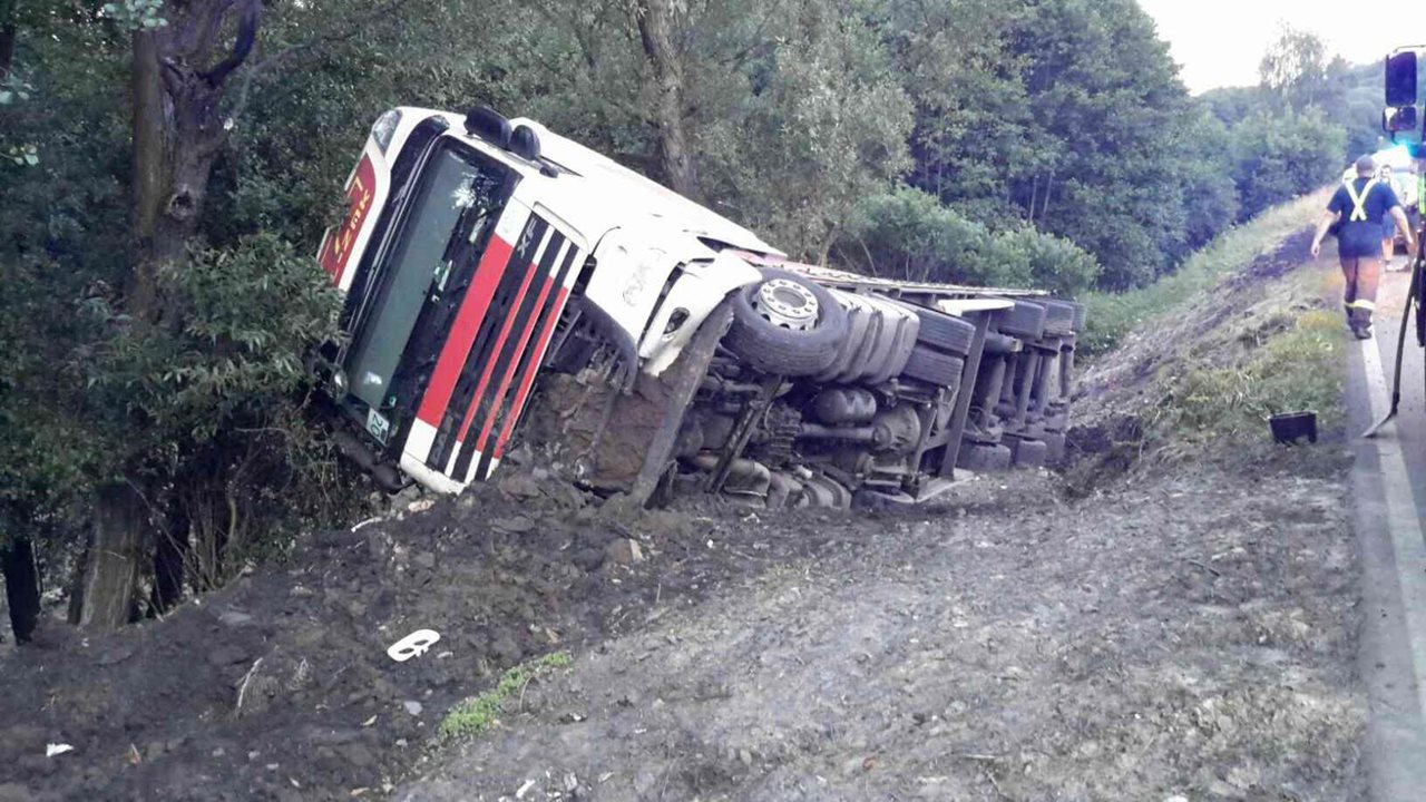 Osobní auto skončilo v příkopu, nákladní auto se na něj převrhlo, z nákladového prostoru se vysypalo uhlí.