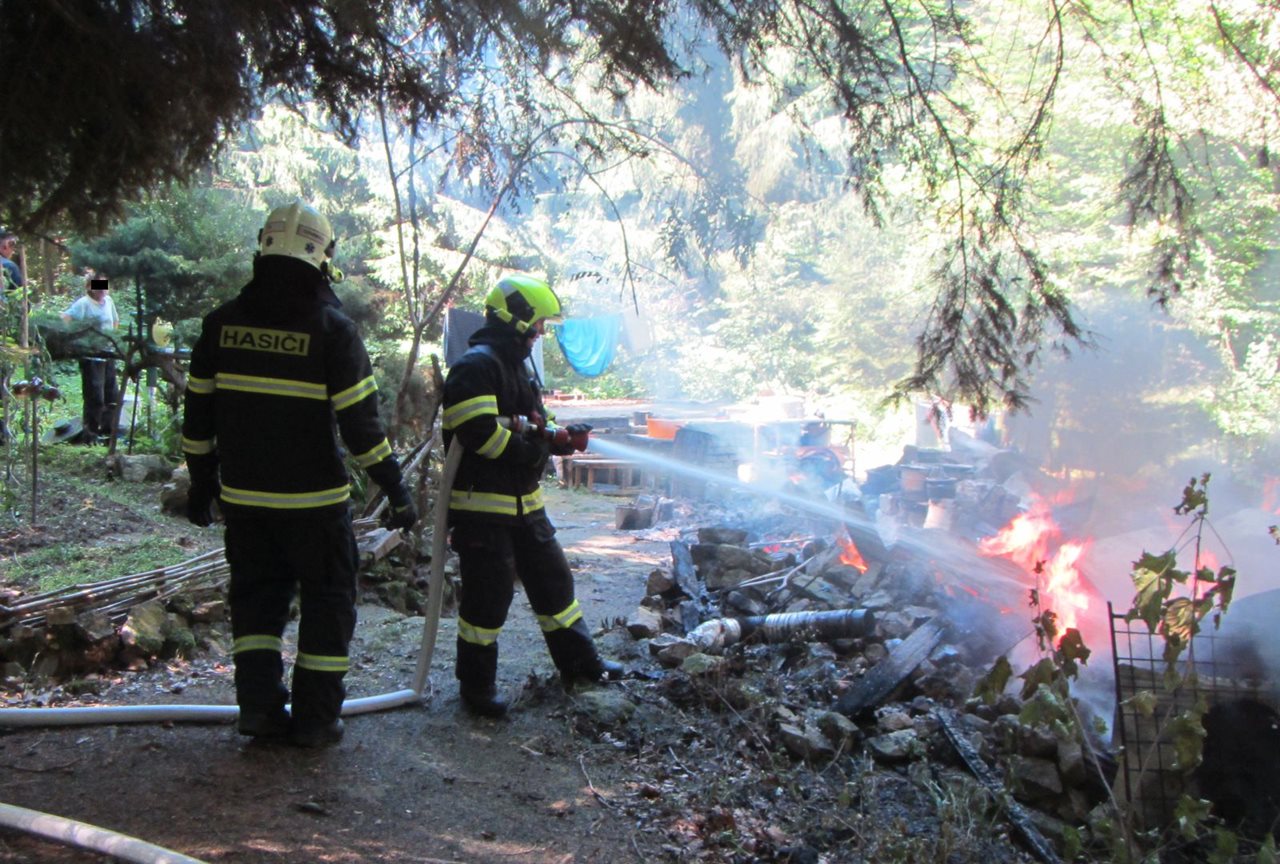 Dvě jednotky hasičů likvidovaly 29.7.2017 požár chatky v okrajové části Zlína. V 12:29 hodin vyjely tři cisternové automobily profesionálních hasičů centrální stanice Zlín a hasičů jednotky města Zlína z Prštného na místo hlášeného požáru chatky poblíž ulice Hradská v sídelní jednotce Zlín – Tlustá Hora. V době příjezdu hasičů na místo byl objekt o půdorysu asi 5 x 3 metrů s přístřeškem požárem zcela zničen a jeho zbytku dohořívaly. Pomocí jednoho útočného proudu hasiči srazili plameny, prostor ochladili a po částečném rozhrabání zbytků objektu a jeho vybavení celé požářiště prolili vodou. Při hašení byla ze zbytků objektu vynesana také jedna tlaková láhev. Podle vyjádření uživatele objektu došlo ke vzniku požáru v době jeho krátkodobé nepřítomnosti, kdy topil k kamnech na pevná paliva v interiéru chatky. Ještě před příjezdem hasičů se sám pokoušel požár uhasit vodou z blízké studny. To se mu nepodařilo a při zásahu utrpěl popáleniny na hlavě a ruce. Ty mu ošetřili záchranáři, které velitel zásahu povolal na místo. Podle všech zjištění vyšetřovatele hasičů stálo za vznikem požáru nedbalostní jednání. Při požáru bylo zasaženo také blízké elektrické vedení na němž mohla podle vyjádření energetiků vzniknout škoda ve výši až 100.000 korun. Škodu způsobenou na objektu a vybavení uživatel odhadl na 30.000 korun. Zdroj: por. Bc. Libor Netopil, tiskový mluvčí HZS Zlínského kraje Foto: HZS Zlínského kraje