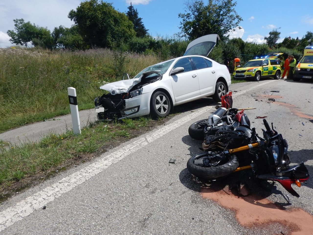 Jen sedm minut dělilo v neděli 23. července dvě ohlášení na tísňovou linku u nehodách motorkářů. Obě nehody se staly na Táborsku, u jedné musel zasahoval vrtulník LZS. Profesionální hasiči ze stanice Tábor zasahovali od 14:12 hodin na silnici I/3 u Sudoměřic u Tábora, kde se srazily osobní auto značky Škoda Octavia a motorka Yamaha. V době příjezdu hasičů u nehody již zasahovaly Policie ČR a ZZS včetně LZS. Při nehodě bylo zraněno celkem pět osob. Zraněné osoby byly mimo vozidlo a motocykl v péči zdravotníků, vyproštění nebylo potřeba. Táborská jednotka zajistila oba dopravní prostředky proti požáru. Z Octavie unikla chladicí kapalina a motorový olej, které hasiči zlikvidovali sorbentem. Hasiči dále pomohli s transportem zraněného motorkáře do vrtulníku LZS. Po zadokumentování nehody Policií ČR jednotka spolupracovala při nakládce vozidel odtahovou službou a po uvolnění komunikace provedla její úklid od sorbentu, střepů a plastů. Jen v rozmezí několika minut zasahovali hasiči na Táborsku u obdobné nehody. Osobní auto značky Corvette Sinrray se srazilo s motorkou značky Yamaha na dálnici D3 v katastru obce Horusice. Hasiči spolupracovali se zdravotníky ZZS při resuscitaci zraněného motorkáře. Havarované auto i motorku zajistili protipožáru. Zároveň po dobu zásahu řídili provoz na frekventované komunikaci. I tuto nehodu šetřila Policie ČR. Zdroj: Vendula Matějů –tisková mluvčí Jihočeský kraj Foto: HZS Jihočeský kraj