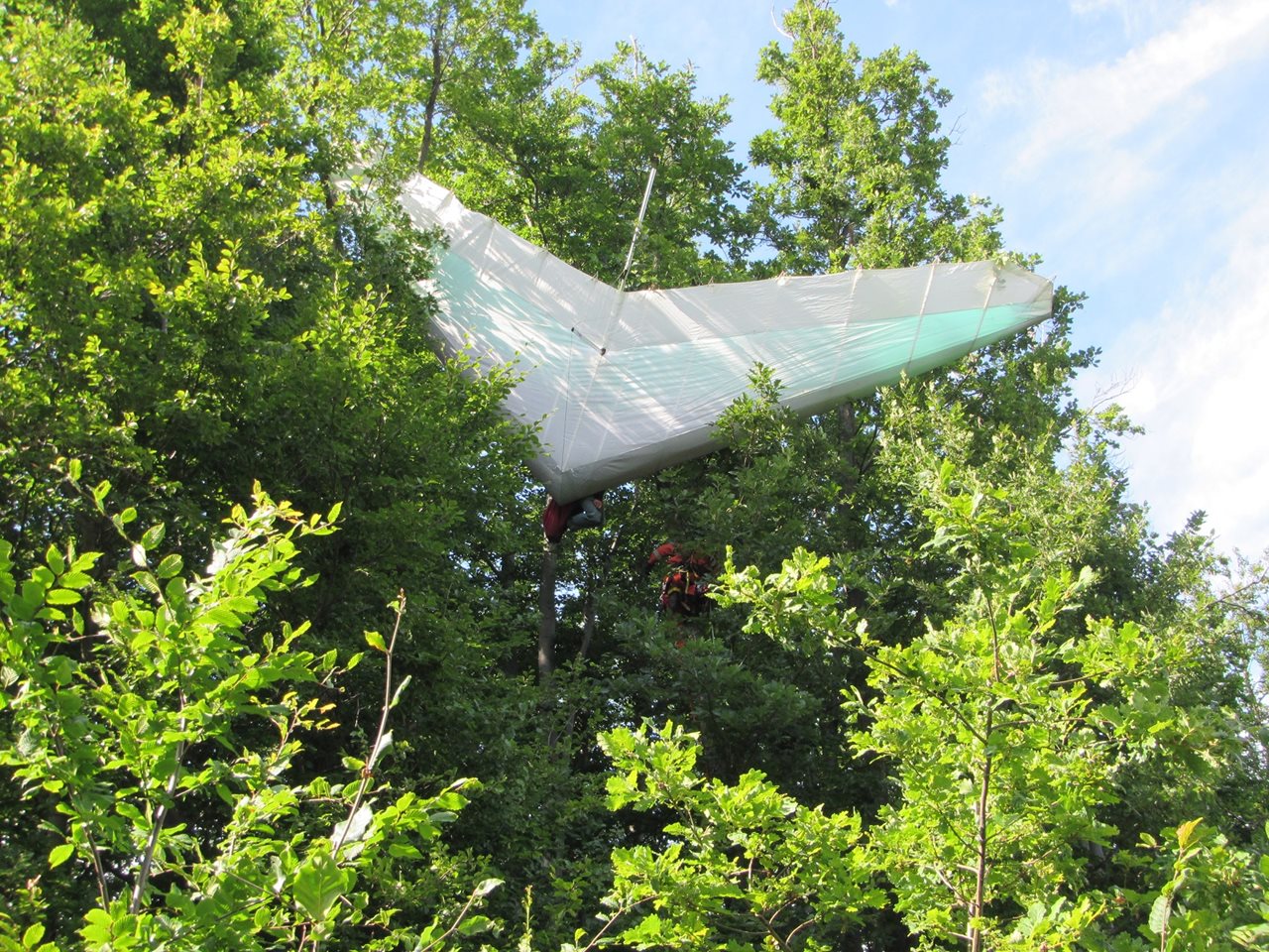 Rogalo s pilotem zůstalo viset na stromu 15 metrů nad zemí