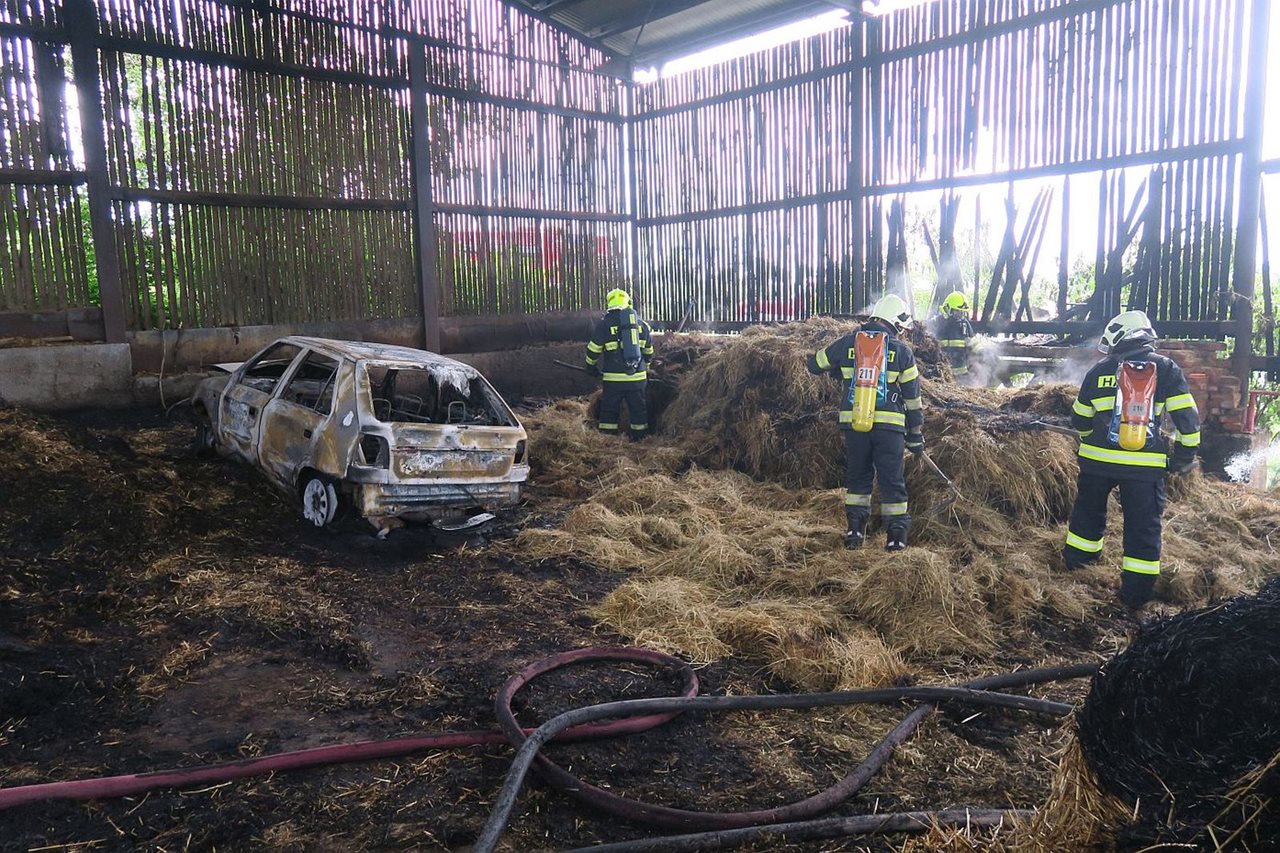 Plameny zničily osobní vozidlo, uskladněné balíky slámy a část seníku