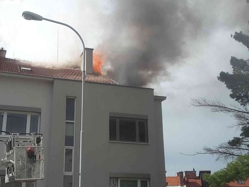 V úterý 6.6.2017, k likvidaci požáru na ulici Slezská ve Zlíně byly vyslány čtyři jednotky hasičů. Čtyři cisterny a dva automobilní žebříky zamířily bezprostředně před sedmnáctou hodinou na místo hlášeného požáru bytu v šestém patře jednoho z bytových domů na ulici Slezská v městské části Zlín – Jižní Svahy. Jako první dorazili na místo profesionální hasiči z centrální stanice Zlín a hasiči jednotky města Zlína. Ti rychle rozvinuli dopravní vedení a jeden útočný proud a vybaveni dýchací technikou vnikli do zasaženého bytu. Jak zjistili, požár vznikl na balkonu a přes plastové okno se měl snahu rozšířit do obytné místnosti. Tomu už ale hasiči svým zásahem zabránili. Kouř, saze a sálavé teplo však stačily vybavení bytu znečistit a částečně poškodit. Vzhledem k rychlé lokalizaci požáru mohl velitel zásahu odvolat jednotky otrokovických profesionálních hasičů a dobrovolných hasičů z Fryštáku, které směřovaly na místo zásahu. Po likvidaci plamenného hoření hasiči nasadili k odvětrání bytu přetlakovou ventilaci. V důsledku požáru došlo také k poškození ventilu topení a úniku vody. V 18:32 hodin ohlásil velitel zásahu celkovou likvidaci události. Před příjezdem hasičů byla provedena evakuace obyvatel domu. Na místě zasahovali také policisti a strážníci a následně také záchranáři, kteří zkontrolovali a ošetřili dvě dospělé osoby a dvě děti. Příčinou vzniku požáru a výší způsobené škody se zabývají vyšetřovatelé hasičů a policistů. Autor: por. Bc. Libor Netopil, tiskový mluvčí HZS Zlínského kraje Foto: HZS Zlínského kraje