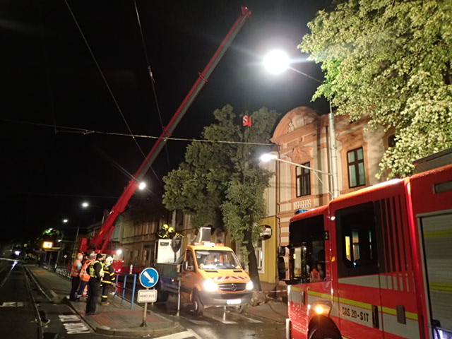 Celkem 31 výjezdů kvůli večerní bouřce a silnému větru mají na kontě profesionální a dobrovolní hasiči v Moravskoslezském kraji v noci z úterý na středu 7.6.2017. Vyjížděli v okresech Ostrava-město (21), Frýdek-Místek (7) a Karviná (3), hlavně k popadaným stromům. V Ostravě odstraňovali stromy 20x. V některých případech znamenal jeden výjezd i více pořezaných a odklizených stromů. Nejvíce výjezdů (téměř 30) zaznamenali hasiči především v úterý 6.6.2017 od 21. do 23. hodiny. Není vyloučeno, že ještě během středečního rána (po rozednění) bude počet výjezdů narůstat. Za celé úterý a středeční ráno nevyjeli moravskoslezští hasiči ani jednou k čerpání vody. Zmiňované události si nevyžádaly žádná zranění ani vyšší škody, pokud nepočítáme částečně utrženou střechu o ploše 10 x 10 metrů v Ostravě-Jihu v Horní ulici, kterou rozebírali hasiči ze stanice HZS MSK v Ostravě-Zábřehu a házeli na zem mezi domy, a poškozený sloup veřejného osvětlení s dopravní značkou v ostravské Plzeňské ulici. Na snímcích z Nádražní ulice (Moravská Ostrava) hasiči ze tří jednotek HZS MSK (Fifejdy, Přívoz a Zábřeh) odstraňovali v úterý pozdě večer nakloněný strom, opřený o fasádu domu, a to pomocí jeřábu AJ AC60 Demag/Terex (Ostrava-Zábřeh), a také automobilové plošiny AP 42 MB Econic (Přívoz). Lípa měla 25 metrů, průměr kmene 55 cm. Druhá série ukazuje spadlou lípu na plot mateřské školy v ulici Josefa Lady (Moravská Ostrava). Odstranila ji dnes ráno pomocí motorové pily jednotka HZS MSK Fifejdy. Lípa měla asi 20 metrů, průměr kmene 50 cm. Petr Kůdela, tiskový mluvčí – HZS Moravskoslezského kraje Foto: HZS Moravskoslezského kraje