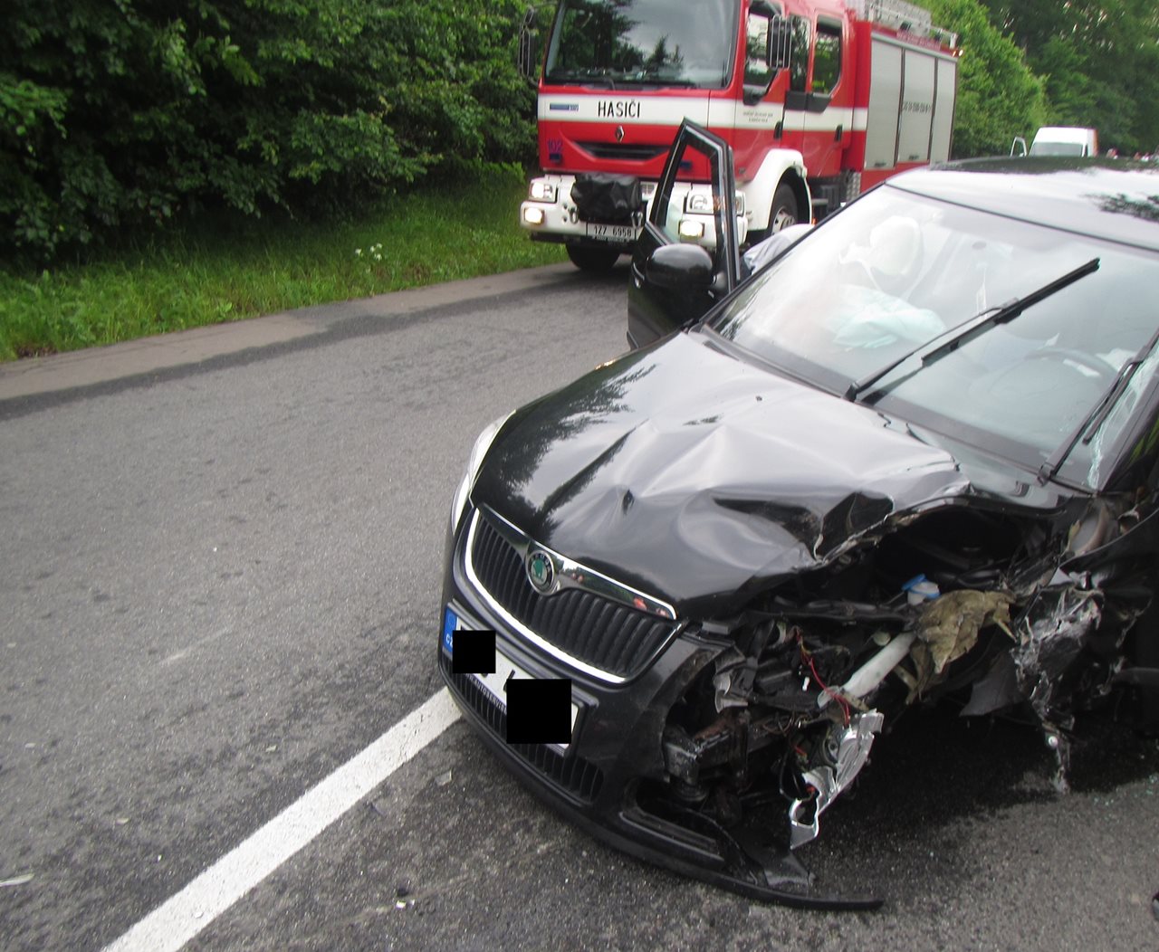 V neděli,4. 6. 201, dopoledne došlo k dopravní nehodě dvou osobních vozidel u města Otrokovice. Oznámení o nehodě dvou osobních vozidel v Tlumačově, ve směru na Otrokovice, přijali hasiči v 7:05 hodin. Oznamovatel dále sdělil, že v jednom z vozidel je zaklíněná jedna osoba. Na místo nehody byla vyslána jednotka profesionálních hasičů z požárních stanic z Otrokovic a z Holešova. Nehoda se stala na hranici katastru Otrokovice a Tlumačov, na silniční komunikaci č. 438, v křižovatce před místní částí Terezov. V době příjezdu hasičů, byly zraněné osoby z jednoho vozu v péči lékaře zdravotnické záchranné služby. Osoba, řídící sportovní užitkové vozidlo, byla bez zranění. Jedna z osob byla ve voze zaklíněna. Hasiči ji ještě před příjezdem dvou sanitních vozů vyprostili pomocí hydraulického vyprošťovacího zařízení. Na páteřní desce zraněného přenesli do sanitního vozu. Hasiči na obou autech provedli protipožární opatření. Z vozidel nevytekly žádné pohonné hmoty ani oleje. Ve voze, z něhož byla vyprošťována zraněná osoba, byl jorkšírský teriér. Hasiči mu dali vodu a v době odstraňování následků nehody se o něj starala kolemjedoucí cyklistka. Později byl pes předán do péče Městské policie Otrokovice. Silnice byla po celou dobu práce hasičů a zdravotníků oboustranně uzavřena. Zraněné osoby byly sanitkami odvezeny k dalšímu ošetření do nemocnice. Po odjezdu sanitních vozů byla silnice zprůjezdněna jedním jízdním pruhem. Hasiči pomohli s naložením jednoho auta na vůz odtahové služby, uklidili komunikaci a vrátili se zpět na stanici. Autor: nprap. Roman Žemlička – HZS Zlínského kraje Foto: HZS Zlínského kraje