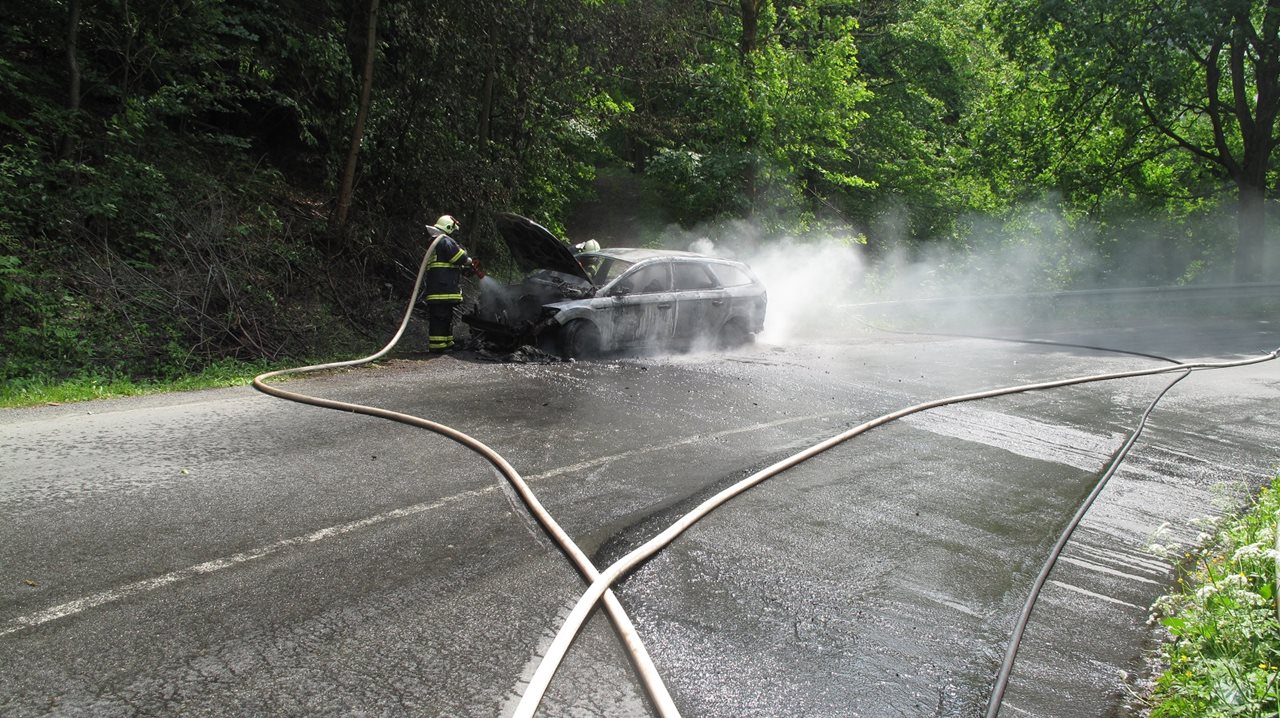 V neděli 4. 6. 201, po poledni, shořelo jedno osobní auto v blízkosti obce Hutisko–Solanec na Vsetínsku. Hlášení o požáru auta v motorovém prostoru v části obce Solanec pod Soláněm přijali hasiči v 12:22 hodin. K uhašení plamenů byla vyslána jednotka Hasičského sboru města Rožnov pod Radhoštěm a jednotka dobrovolných hasičů obce Hutisko-Solanec. Obě jednotky vyjely s dvěma automobilovými stříkačkami. V době příjezdu hasičů už bylo celé vozidlo Ford Mondeo v plamenech. Hasiči nasadili k uhašení požáru jeden vysokotlaký proud vody a jeden útočný proudu vody C. Dále provedli umístění sorbčních hadů, aby zabránili odtoku znečištěné vody a případných ropných produktů provozních náplní do potoka. Na místo požáru se dostavila Policie České republiky a vyšetřovatel hasičů. Ve voze jely dvě osoby, které měly vozidlo vypůjčené. Ty sdělily vyšetřovateli hasičů, že jely z Velkých Karlovic. Při jízdě přes Soláň ucítiliy zápach pálících se plastů. Na nejbližším odpočívadle zastavily a zvedly kapotu motoru. Mezi blokem motoru a motorovou přepážkou uviděliy probleskovat plameny. Bohužel však u sebe neměly hasicí přístroj, kterým by vznikající požár uhasily. Mohly tak zabránit nebo alespoň omezit šíření požáru. Škoda způsobená požárem byla určena v předběžné výši 150 000 korun. Autor: nprap. Roman Žemlička – HZS Zlínského kraje Foto: HZS Zlínského kraje