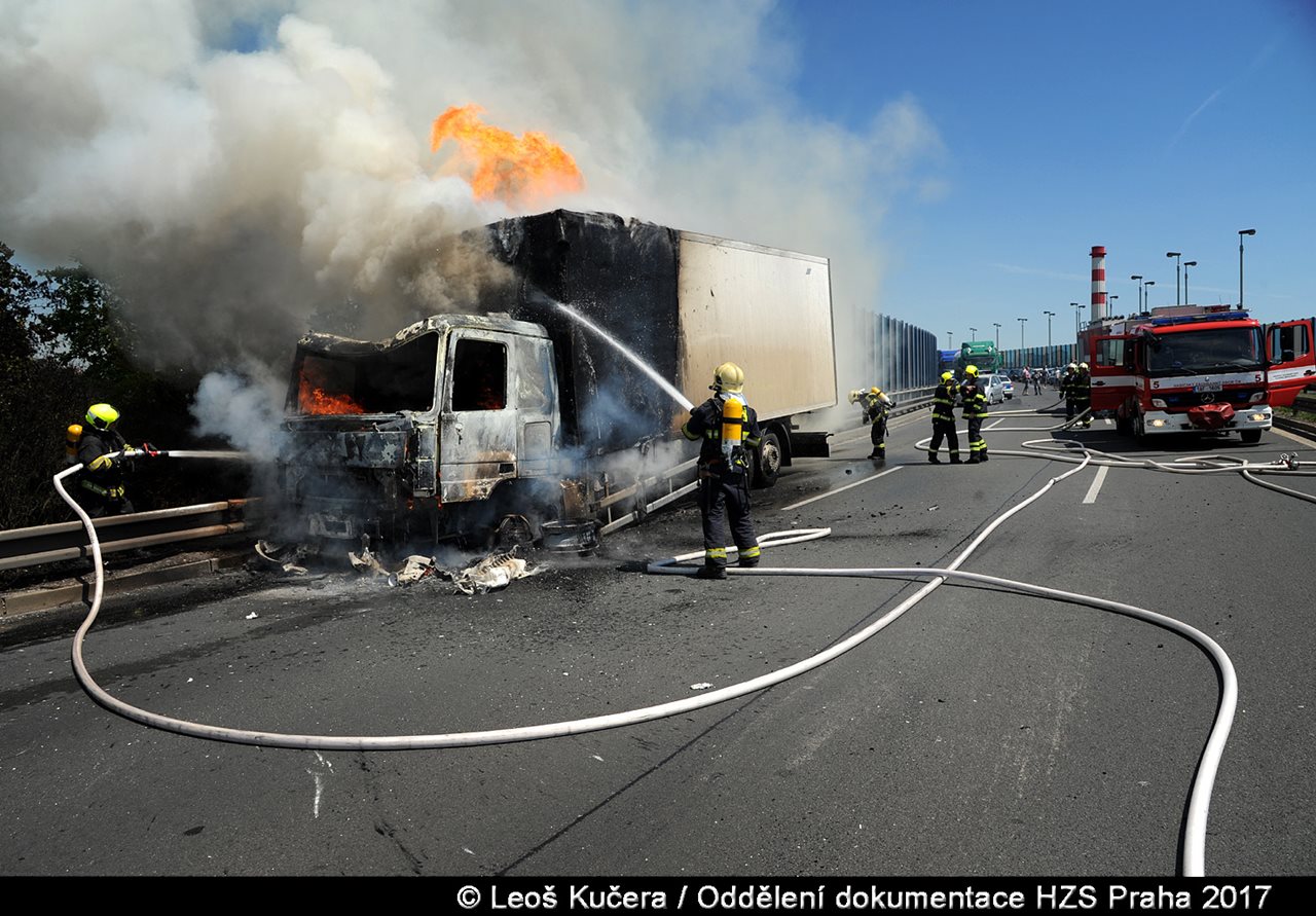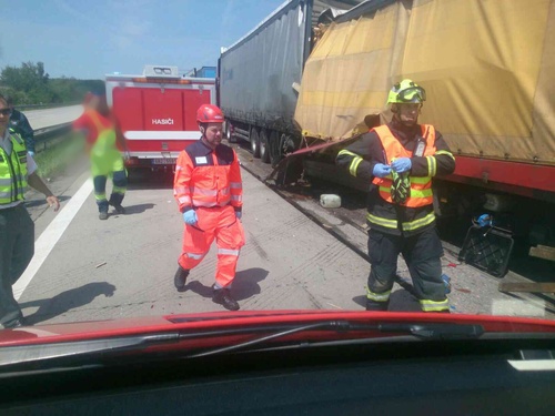 Dvě dopravní nehody kamionů poblíž sebe v pondělí, 29.května 2017, odpoledne zcela ochromily dálnici D1 za Brnem ve směru na Prahu. Jeden člověk při nehodě zemřel, tři lidé se zranili. K první nehodě vyjížděly jednotky po dvanácté hodině. Stala se na 172. km. Cestu k zásahu opět komplikovali neukáznění řidiči, kteří nerespektují vytvoření tzv. záchranné uličky ještě před příjezdem záchranných složek a výrazně tím zpomalují dojezd našich vozidel. Navíc se po průjezdu hasičských vozů opět vracejí do jízdních pruhů a tím zpomalují další přijíždějící techniku. Hasiči na místě zjistili, že se jedná o nehodu tří kamionů. Kabina jednoho z nich při tom byla zcela zapasovaná do zadní části dalšího kamionu. Přibližně po 20 minutách se podařilo hasičům dostat ke zdevastované kabině. Řidič však střet nepřežil. Řidič z dalšího kamionu se zranil. Následovalo asi dvouhodinové vyprošťování těla zemřelého řidiče, přičemž bylo nutné nadzvednout pobořenou střechu kabiny a kompletně ji odstranit. Vzhledem k tomu, že byl provoz na dálnici ve směru na Prahu zastaven, vytvořila se před nehodou několikakilometrová kolona. Naše operační středisko obdrželo informaci, že někteří z cestujících v koloně potřebují v souvislosti s třicetistupňovým horkem naléhavě tekutiny. Hasiči proto v koloně poskytovali lahve s vodou. Dálnice byla kompletně průjezdná až v 18 hodin. Nicméně kolony přetrvávaly a to zejména u druhé nehody na 181.kilometru. Hasiči k místu vyjížděli krátce po 13. hodině a pracovali u nehody až do zajištění průjezdnosti obou jízdních pruhů po 19. hodině. Při nehodě čtyř kamionů se dva lidé zranili. Nikoho nebylo nutné vyprošťovat. Jaroslav Mikoška, tiskový mluvčí - HZS JmK Foto: HZS Jihomoravský kraj