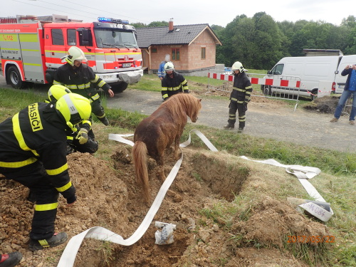 Dvě jednotky hasičů z okresu Frýdek-Místek se zapojily v pondělí 22.5.2017 do záchrany poníka, který skončil uvězněn ve velmi úzkém výkopu pro vodovodní přípojku v obci Sedliště. Během čtvrthodinky byl nezraněný poník opět venku, když zachránci použili na jeho vytlačení do širších míst výkopu hasičskou hadici. Odtud už bylo zvíře schopno vyskočit na zemský povrch samo.             Operační středisko hasičů bylo o uvězněném poníkovi informováno v pondělí po osmé hodině ranní. Do Sedliště, kde se buduje nový vodovod, vyjela jednotka Hasičského záchranného sboru Moravskoslezského kraje (HZS MSK) ze stanice Frýdek-Místek, společně s ní jednotka dobrovolných hasičů ze Sedliště.             Zvědavý poník předtím slezl do širší části výkopu pro vodovodní přípojku a pomalu dokráčel až do zúženého místa. Dešťová voda zde byla jen na dně. Otočit nešlo, couvat jej nenapadlo. Až přivolaným hasičům se jej podařilo pomocí jemného táhnutí za ohon a opatrného tlačení prázdnou hasičskou hadicí B „nacouvat“ zpět do rozšířené části výkopu, kde se otočil a poté bez jakýchkoli následků odběhl na další chutnou pastvu.             Hasiči měli připravenu i krizovou variantu, pokud by poník sveřepě odmítal couvat. Byli domluveni s obsluhou bagru, že rozšíří výkop před poníkem. Petr Kůdela, tiskový mluvčí-HZS Moravskoslezský krajského Foto: HZS Moravskoslezský kraj