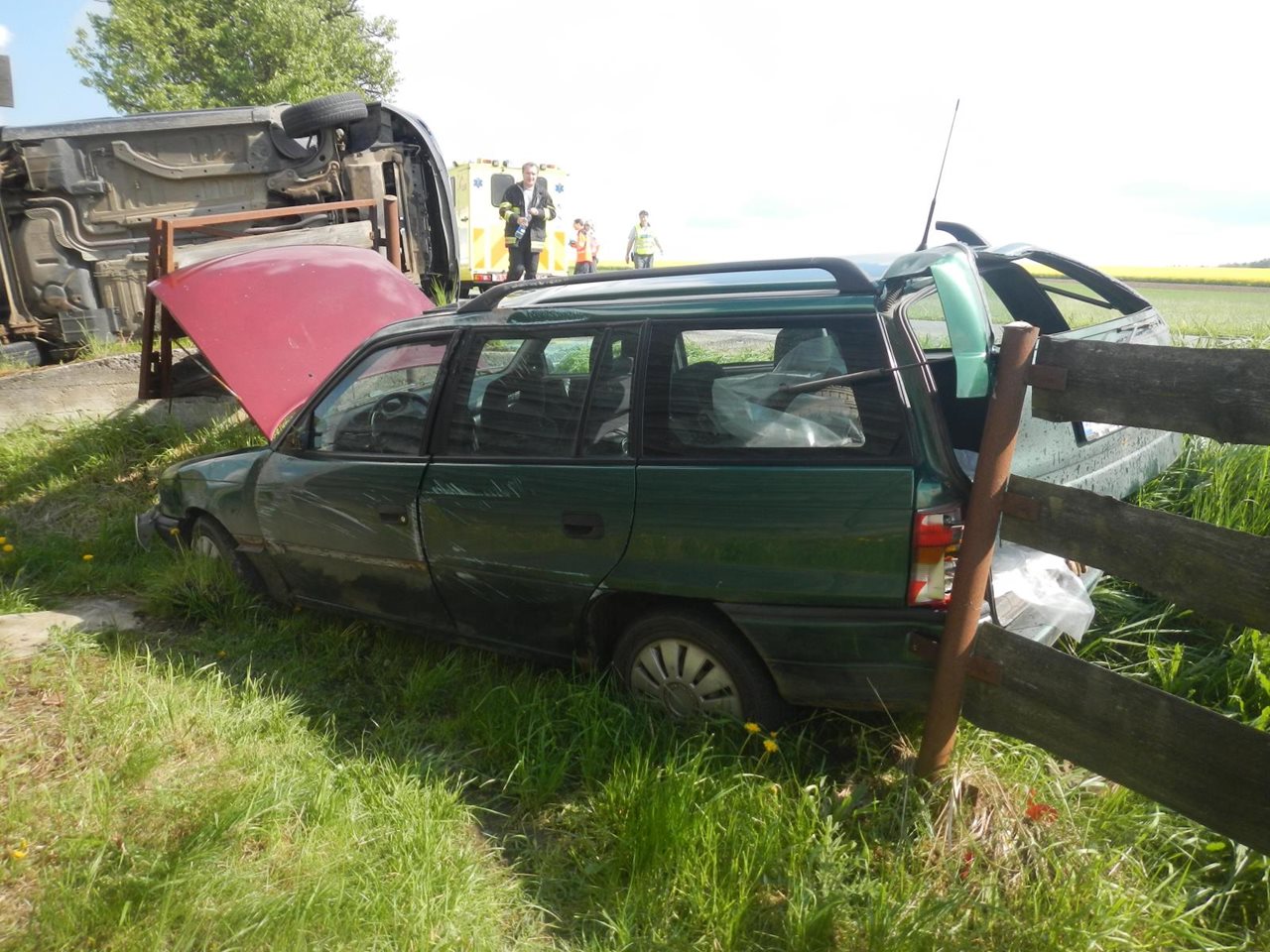 Vozidlo skončilo převrácené mimo silnici. Jednoho ze zraněných transportoval vrtulník.