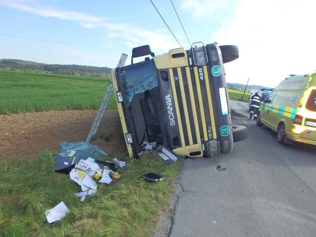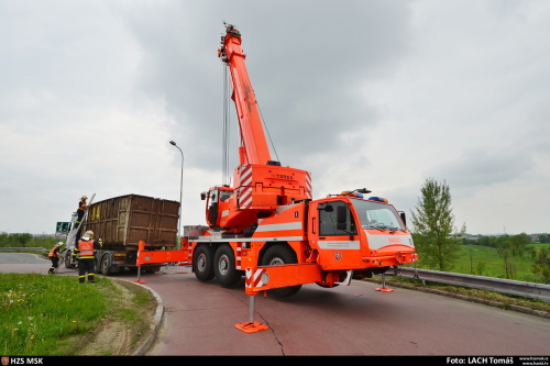 S pomocí vyprošťovacího speciálu Mercedes Actros Bizon a silného jeřábu Demag/Terex vyprošťovali profesionální hasiči v pondělí 15.5.2017 dopoledne na území Moravskoslezského kraje hned dva nepojízdné kamiony. První z nich (Volvo) skončil v pondělí ráno v obci Vendryně (okres Frýdek-Místek) pravými koly v příkopu, nakloněný nad autosalonem, a vezl minerální vlnu. Druhý (MAN) - s nákladem kovového odpadu, které se částečně vysypalo na silnici - ještě během dopoledne v Ostravě-Hrabové. Obě nehody se obešly bez zranění a bez větších úniků provozních kapalin. Ve Vendryni asistovala tradičnímu vyprošťovacímu týmu „Bizon-jeřáb-pojízdná dílna“, který přijel ze stanice Hasičského záchranného sboru Moravskoslezského kraje (HZS MSK) Ostrava-Zábřeh, jednotka ze stanice HZS MSK v Třinci, v Hrabové zase jednotka HZS MSK ze stanice Ostrava-Fifejdy. Z kontejneru na nákladním automobilu MAN, který skončil v Ostravě-Hrabové v Nebeského ulici na pravém boku na silničních svodidlech, na svahu ležela vysypána velká část kovového odpadu. Hasiči před vyprošťováním vozidla vyházeli kvůli odlehčení i další část nákladu. Doprava zde byla omezena jen částečně, vozidlo vyproštěno a postaveno na kola za hodinu. Petr Kůdela - tiskový mluvčí -HZS Moravskoslezského kraje Foto: HZS Moravskoslezského kraje