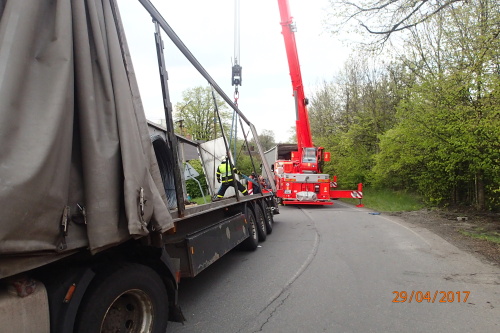 Dvě jednotky profesionálních hasičů (HZS MSK) zasahovaly v sobotu 29.4.2017 kolem poledne v Bohumíně-Záblatí (okres Karviná) u nehody kamionu DAF s nákladem 22 tun drátu smotaných do 11 dvoutunových válců na návěsu, který skončil pravými koly v měkké půdě zapasovaný ve svodidlech. Hlavní slovo měl při vykládce těžkých drátěných válců a pak i při úspěšném vyprošťování DAFu hasičský jeřáb Demag/Terex, pomáhal mu naviják hasičské cisterny. Nehoda se stala v sobotu dopoledne v bohumínské části Záblatí v Bezručově ulici, kam vyjely dvě jednotky Hasičského záchranného sboru Moravskoslezského kraje (HZS MSK) - ze stanic v Bohumíně a Karviné, odkud přijel jeřáb Demag/Terex. Obešla se bez zranění i bez úniku provozních kapalin. Zásah hasičů trval čtyři hodiny. Uzavřenou silnici (MP Bohumín) šlo objet boční ulicí. Hasiči nejprve pomocí jeřábu vyložili několik těžkých drátěných válců (kvůli odlehčení soupravy) na silnici, po příjezdu náhradního kamionu je na něj přímo překládali z havarovaného DAFu, opatrně, ale svižně. Po přeložení sedmi z 11 válců bez větších problémů postavili kamion zpět na kola na silnici - jeřáb návěs zezadu zvedl a naviják hasičské cisterny jej z boku přitáhl na silnici. A tak DAF mohl nakonec z místa nehody se šťastným koncem odjet. Petr Kůdela Tiskový mluvčí HZS Moravskoslezský kraj Foto:HZS Moravskoslezský kraj