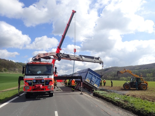 Čtyři jednotky hasičů zasahovaly v pondělí 24.4.2017 ráno a dopoledne u nehody nákladního automobilu MAN s 28 tunami štěrku na korbě, který skončil na silnici z Oder (okres Nový Jičín) do Fulneku v příkopu na pravém boku. Hasiči odklízeli lopatami vysypaný štěrk, jejich těžká technika zvedla bez větších obtíží nákladní automobil zpět na silnici. Únik nafty do příkopu zasypali nasákavým sorbentem.             Operační středisko hasičů bylo o nehodě, která se obešla bez zranění, informováno v pondělí krátce po sedmé hodině ranní. Na silnici I/47 u Oder vyjely tři jednotky Hasičského záchranného sboru Moravskoslezského kraje (HZS MSK) – ze stanic Bílovec, Nový Jičín a Ostrava-Zábřeh – odtud vyprošťovací speciál Mercedes Actros Bizon, jeřáb Demag/Terex a pojízdná dílna, společně s nimi jednotka dobrovolných hasičů Odry.                        Vysypaný štěrk vybral ze dvou třetin soukromý nakladač, o zbytek, který zůstal ležet na boku korby, se museli postarat hasiči lopatami. Prázdný, ale téměř 15titunový nákladní automobil postavil našikmo na okraj silnice zadní naviják Bizona, na silnici jej na všechna kola zvedl během několika minut jeřáb. Odkryl se tím kontaminovaný příkop, kde hasiči zjistili, že ihned po nehodě do něj uniklo zhruba 50 litrů nafty - přes uvolněné víčko palivové nádrže MANu.             Hasiče vystřídala po jejich odjezdu na jejich základny specializovaná sanační firma Ekoaqua, která bude odstraňovat zasaženou půdu v příkopu a na okraji pole. Na místě zjišťovali rozsah škod také pracovníci odboru životního prostředí oderské radnice. Petr Kůdela HZS Moravskoslezského kraje Foto: HZS Moravskoslezského kraje