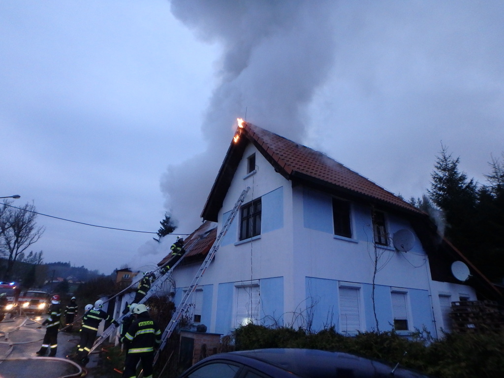Sedm jednotek hasičů zasahovalo v sobotu 15. dubna 2017 ráno u požáru rodinného domu v obci Čermná na Trutnovsku.  Hlášení o požáru obdrželo operační středisko HZS Královéhradeckého kraje v 05:31 hodin. Na místo vyjeli profesionální hasiči z Trutnova, Dvora Králové nad Labem a Vrchlabí, dále dobrovolní hasiči z Hostinného, Mostku, Pilníkova a Rudníku – Arnultovice. Při příjezdu první jednotky dobrovolných hasičů z Hostinného hořela větší část rodinného domu s přistavěnou garáží. Oheň se rychle šířil z dřevěné garáže na terasu obytného domu, do části podkroví a na střechu. V době vzniku požáru byl rodinný dům neobývaný. Hasiči ihned nasadili několik vodních proudů a požár likvidovali nejen ze země, ale také z nastavovacích žebříků. Plameny se jim podařilo dostat pod kontrolu v 06:30 hodin. Dohašování ohnisek a rozebírání poškozených střešních konstrukcí pokračovalo do 10:04 hodin, kdy byl požár zlikvidován. Už po prvotním ohledání místa vzniku bylo zřejmé, že se s největší pravděpodobností jedná o úmyslné založení. Na místo byli proto povoláni speciálně vycvičení psi na vyhledávání hořlavých látek. Hmotná škoda byla předběžně odhadnuta na jeden milion korun, uchráněné hodnoty činí jeden milion korun. Při požáru ani samotném zásahu nebyl nikdo zraněn.  Foto: SDH Hostinné, stanice Trutnov Martina Žahourková Tisková mluvčí HZS Královéhradecký kraj