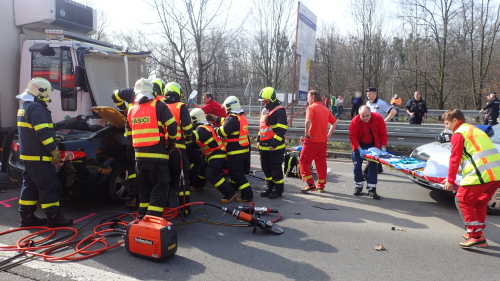 Dvě jednotky profesionálních hasičů (HZS MSK) zasahovaly ve středu 29.3.2017 dopoledne v Ostravě-Porubě u nehody osobního automobilu Honda a nákladního automobilu Iveco, které se střetly na frekventované Rudné ulici. Hasiči museli opatrně vyprostit zraněného a zaklíněného řidiče Hondy ve středním věku, zraněná byla i žena a dítě v osobním autě.             Operační středisko hasičů bylo o nehodě informováno ve středu před půl jedenáctou dopolední. Ve čtyřproudé Rudné ulici nedaleko sjezdu na ulici Nad Porubkou se na konci zúžení (kvůli déletrvajícím stavebním pracím) střetla dvě vozidla a bylo nahlášeno zranění osob. Vyjely tam dvě ostravské jednotky Hasičského záchranného sboru Moravskoslezského kraje (HZS MSK) – ze stanic Poruba a Fifejdy.             Hasiči zabezpečili obě havarovaná vozidla před případným požárem a z místa řidiče v osobním automobilu vyprostili pomocí hydraulických nástrojů zraněného řidiče. Předali jej týmu ZZS MSK, byl transportován vrtulníkem do Fakultní nemocnice Ostrava, další dvě zraněné osoby byly odvezeny sanitkou.             Před uzavřením Rudné ulice hasiči ukazovali řidičům nejrychlejší možnost sjezdu z Rudné ulice. Na menší únik provozních kapalin použili nasákavý sorbent. Na závěr zásahu místo nehody uklidili. Po středečním poledni byla Rudná ulice opět průjezdná. Petr Kůdela tiskový mluvčí HZS Moravskoslezský kraj