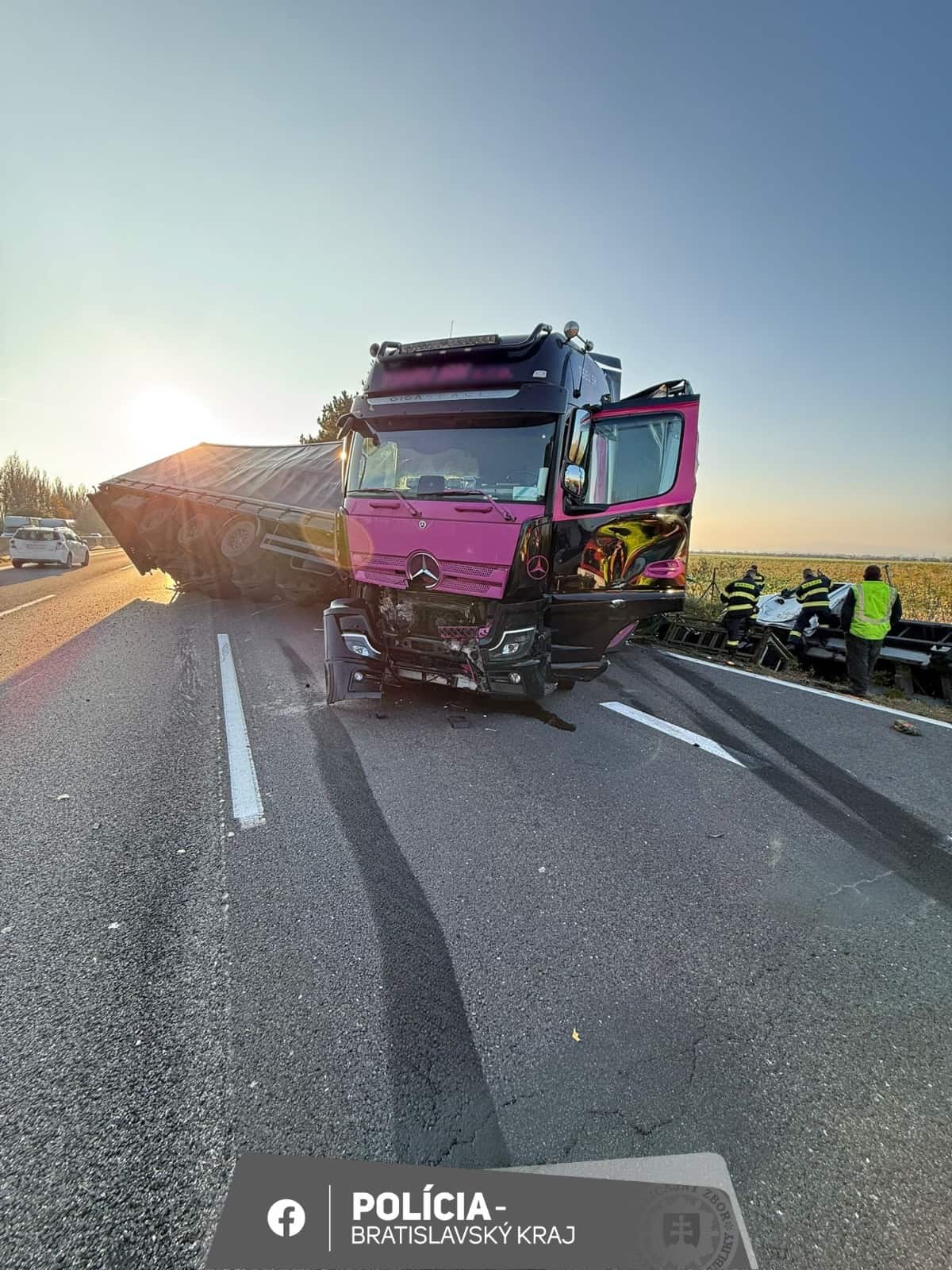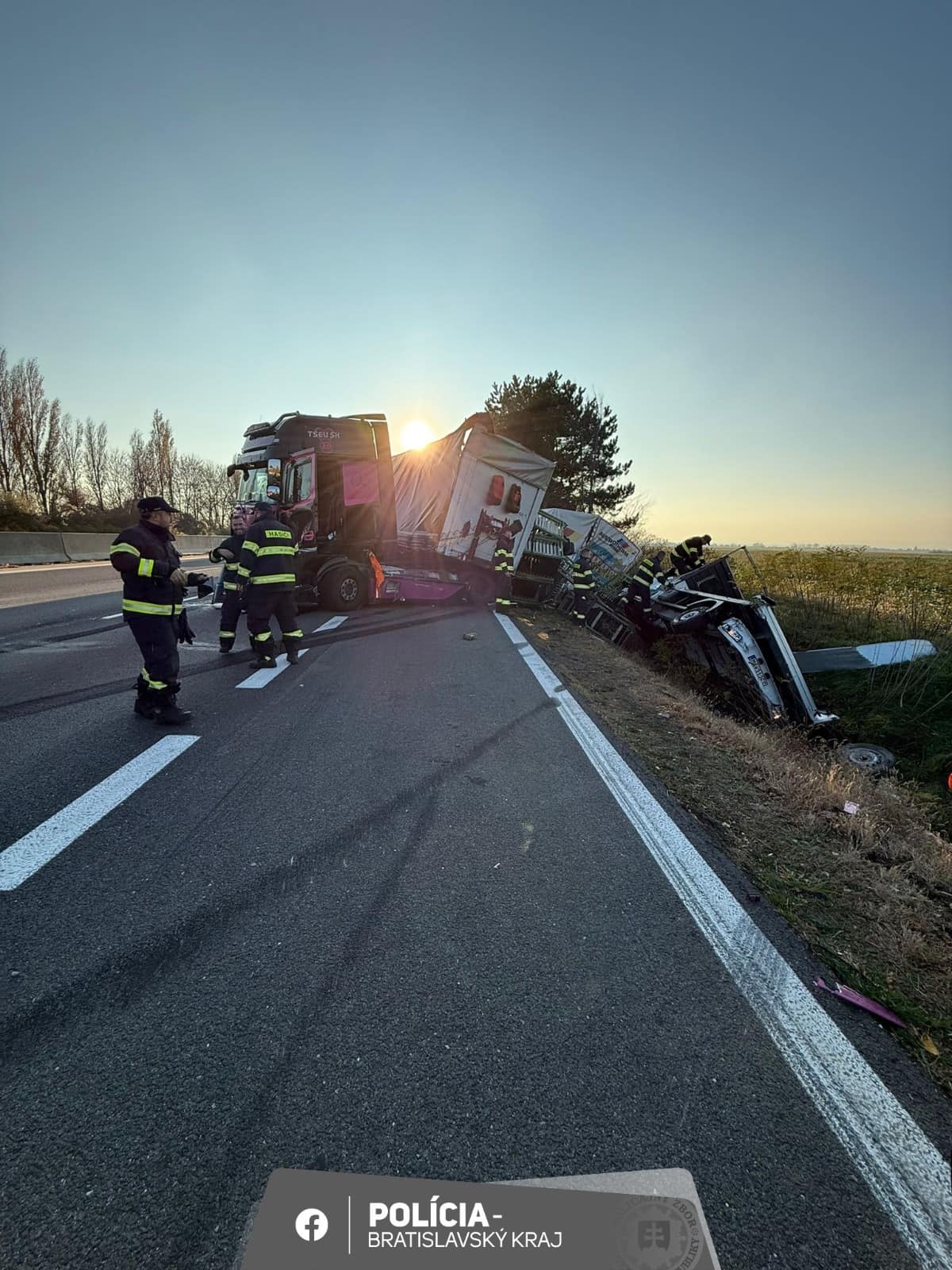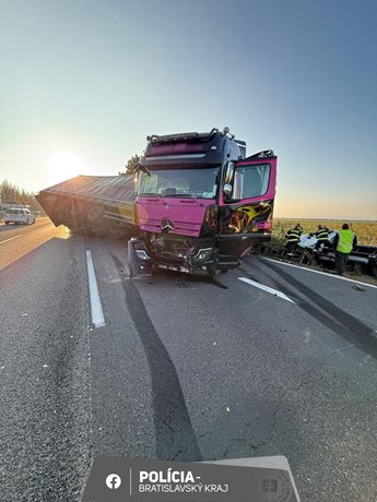 Podle dopravní policie z Bratislavského kraje došlo k nehodě krátce před polednem. Přívěs nákladního vozidla skončil napříč jízdními pruhy na dálnici D1 v úseku mezi Voderadmi a Blatným. Provoz se téměř zastavil, protože volný zůstal jen jeden jízdní pruh.