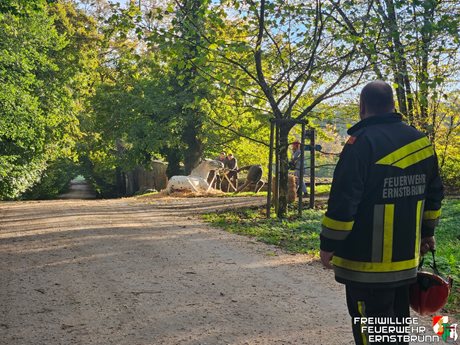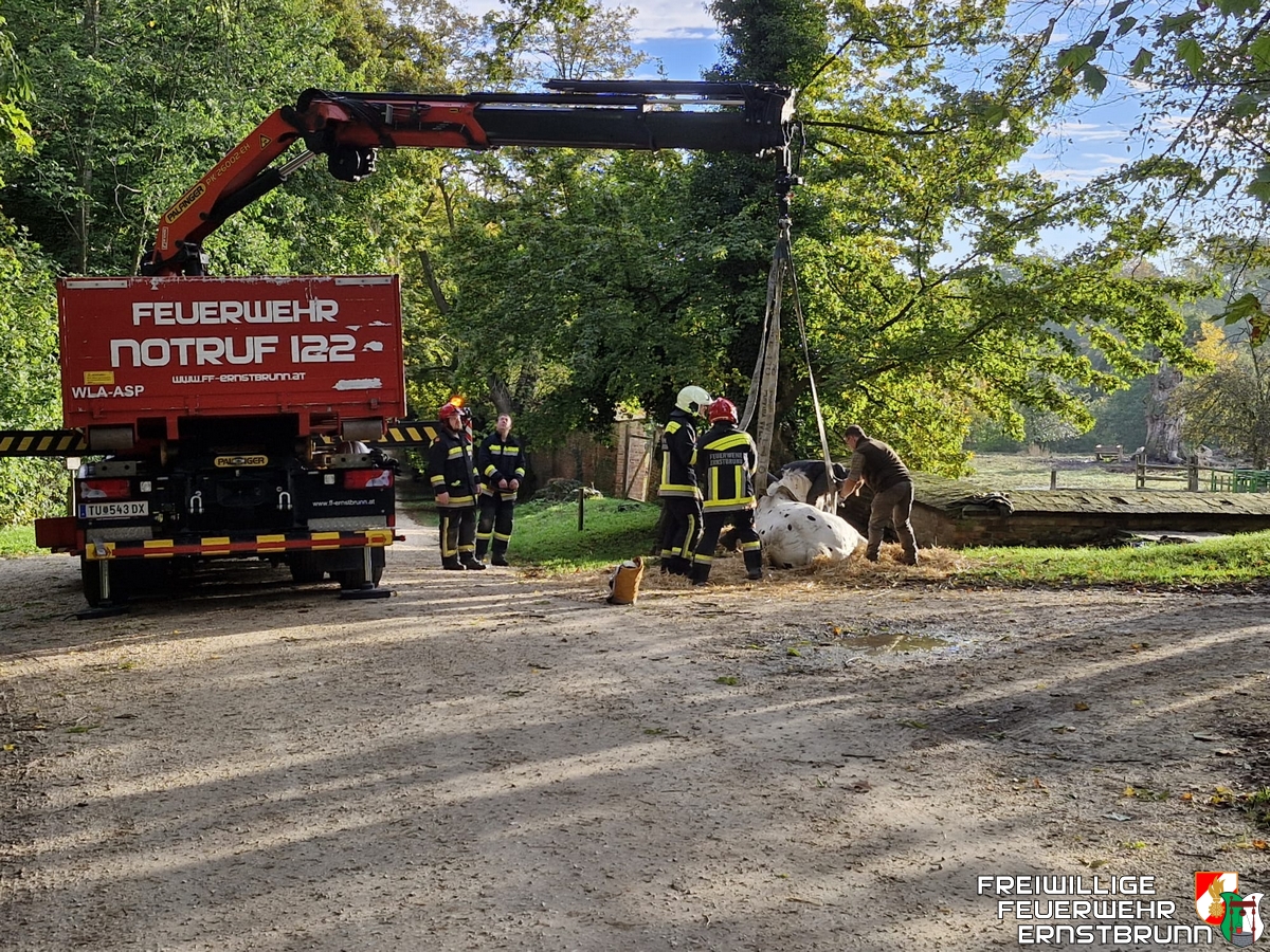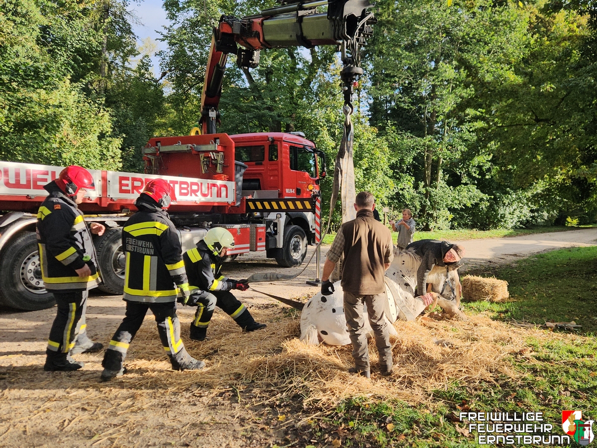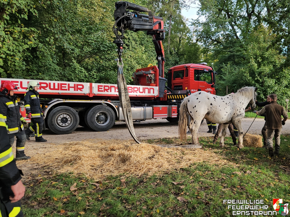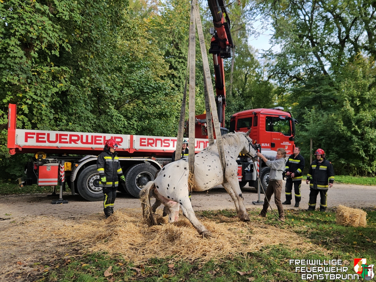 Ve čtvrtek ráno 10. října 2024 obdrželi dobrovolní hasiči hlášení o pomoc při záchraně zvířete v zámku Ernstbrunn. Klisna při procházce prorazila jednou zadní nohou poklop kanálu a upadla. Protože se personálu ani majiteli nepodařilo vysvobodit koně z jeho nesnází, byli hasiči přivoláni na pomoc.