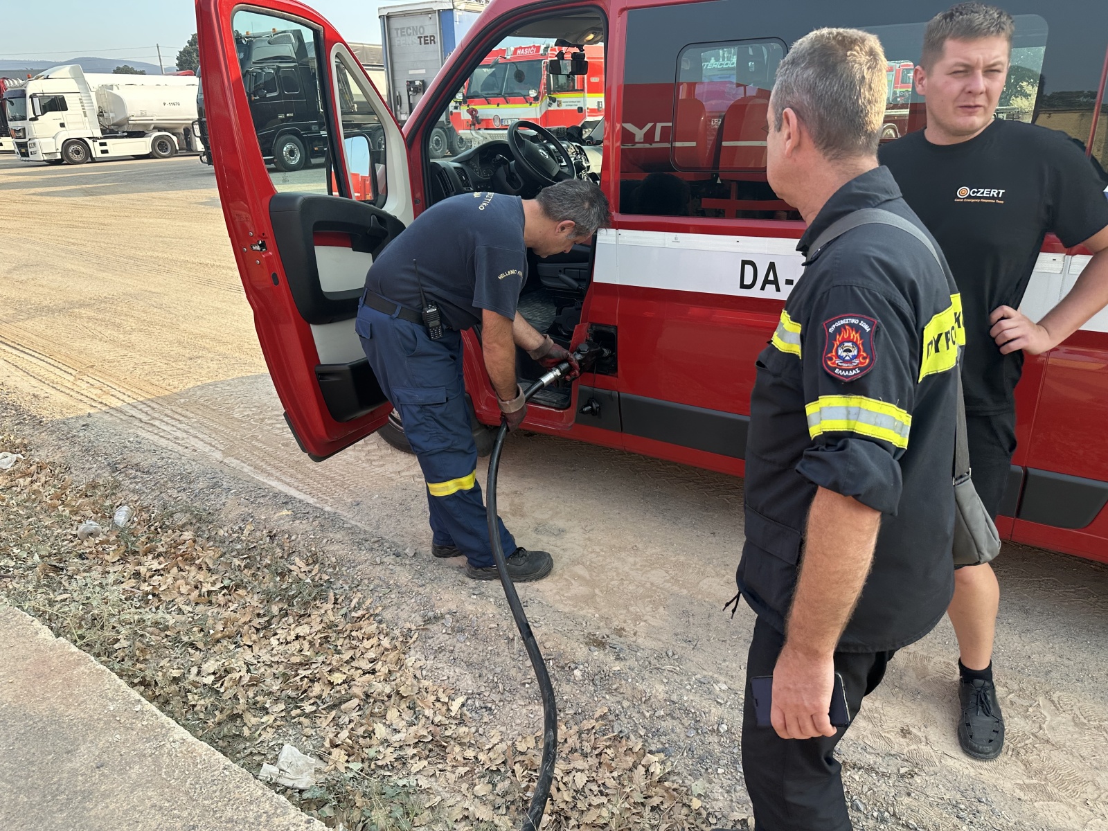 Alexandruopoli - ráno jsme dorazili na místo. Probíhá tankování pohonných hmot a doplňování vody do cisteren od místních hasičů, seřazuje se technika a upřesňuje se místo našeho ubytování a nasazení.