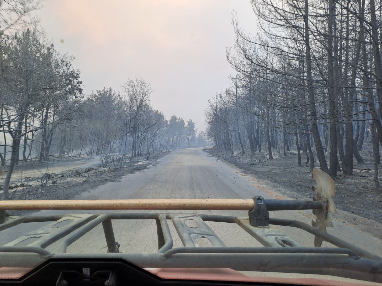 Monitoring doposud bráněného území, hledání skrytých ohnisek na požářišti a jejich likvidace to nás dnes čeká. Jedná se stále o požár, který ohrožoval vesnici Dadia. Pokud se do zítra tato místa dál nerozhoří je v plánu relokace našeho týmu k jinému požáru v zasažené oblasti.