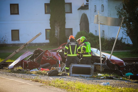 Zcela zničený vůz, trosky vlaku, četné záchranné složky: V Innviertelu narazil ve čtvrtek odpoledne regionální vlak do auta.